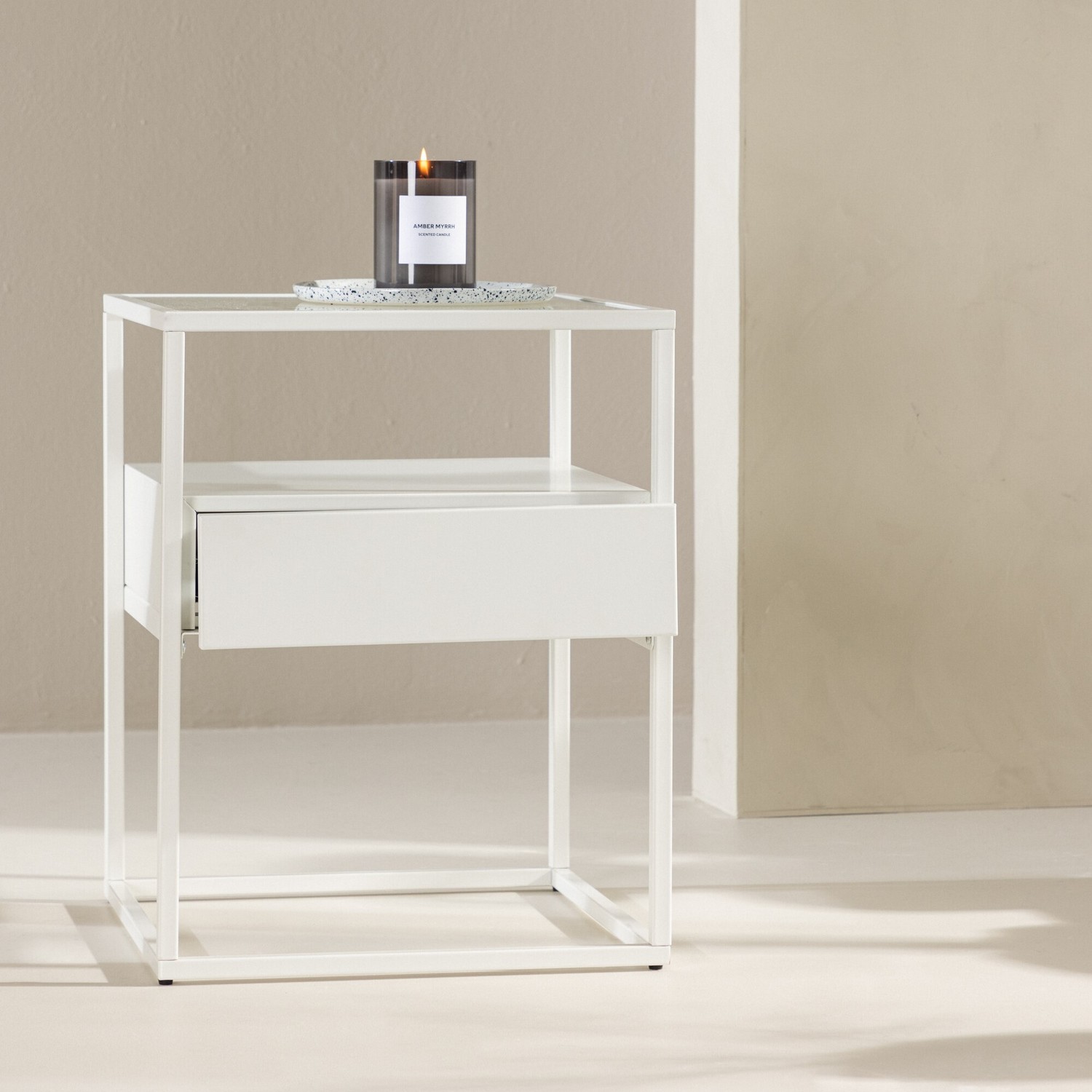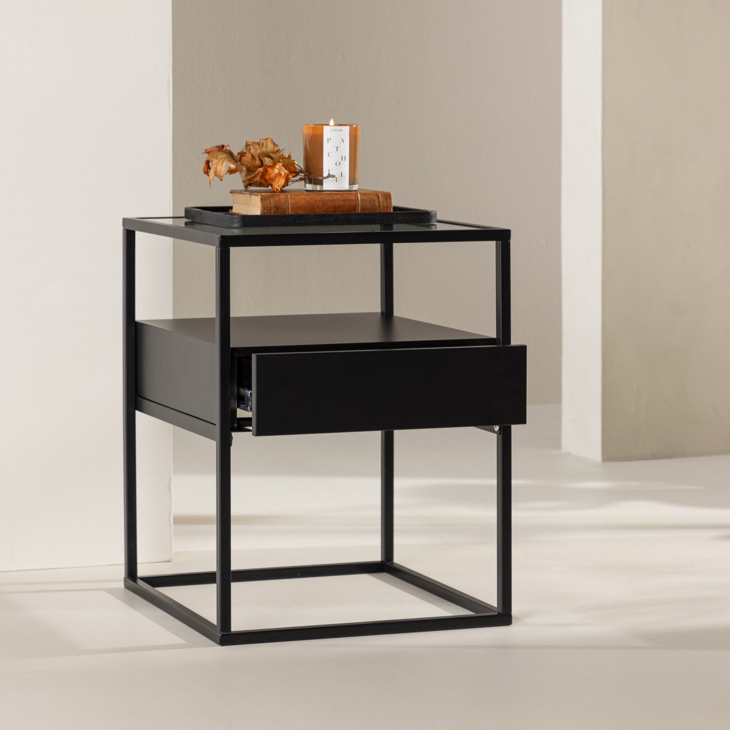 Det här sidobordet har en toppskiva i glas och en ramkonstruktion i stål. Med plats för smidig förvaring är det här sidobordet också utrustat med en diskret låda och hyllplan, vilket möjliggör både dold och synlig förvaring. Aldrig mer oordning – håll dina ägodelar organiserade och pryd med något vacker ljuslykta eller favoritbok för en personlig och hemtrevlig touch.