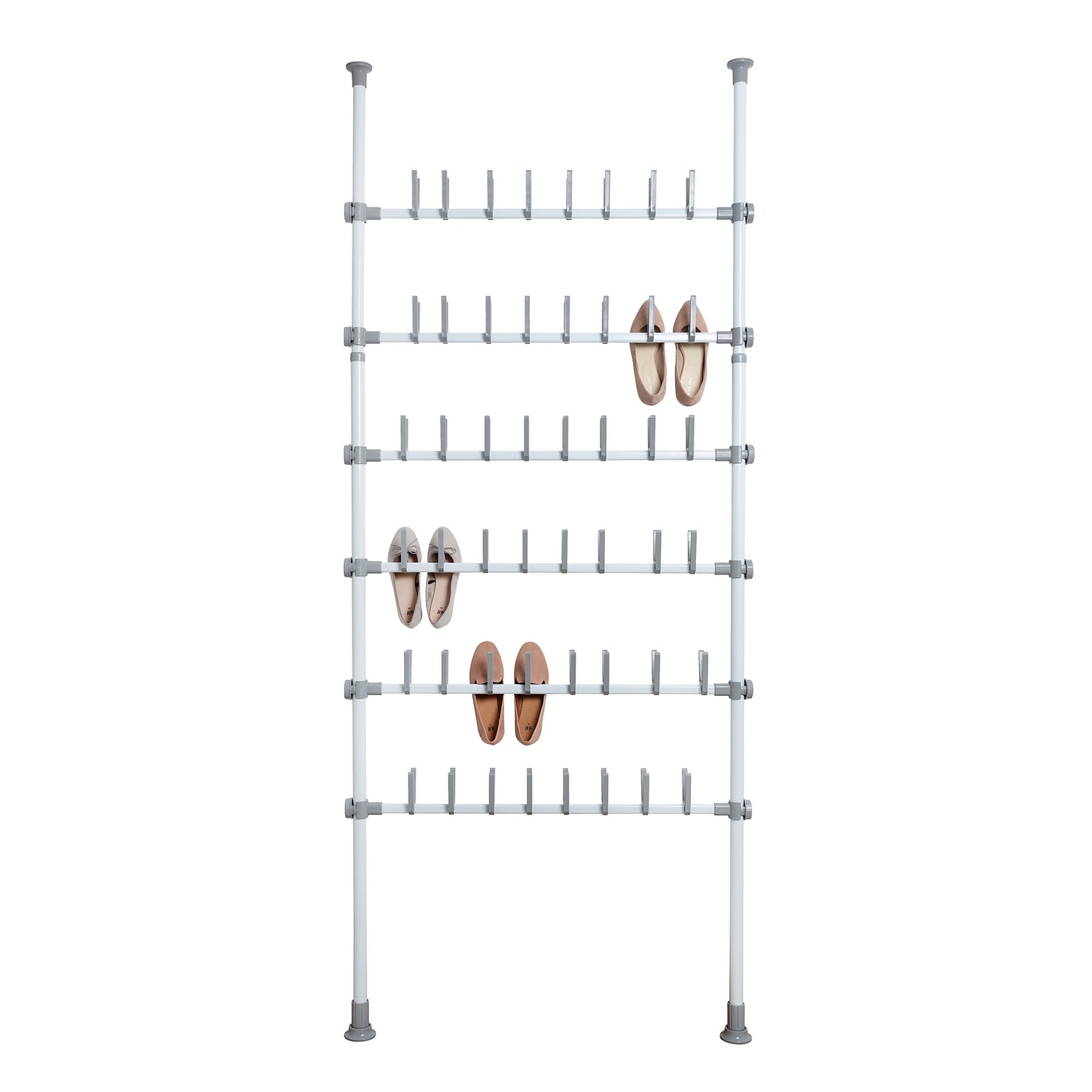 Med detta smarta teleskopsystem för skoförvaring kan du effektivt få skorna bort från golvet och upp på stället. Detta skapar mer fri yta och gör det lättare att hålla ordning på dina skor. Stället har plats för upp till 48 par skor, vilket gör det idealiskt både för den som har en stor skosamling och för barnfamiljer som söker en praktisk lösning. De mångsidiga skohållarna kan bära allt från stilettklackar till sneakers, så hela familjen kan dra nytta av systemet. Monteringen är enkel, eftersom systemet inte kräver borrning, vilket gör installationen snabb och problemfri.