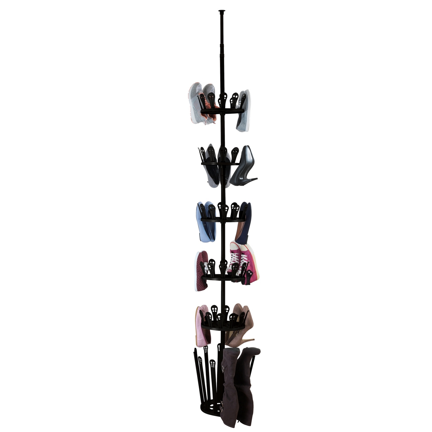 Var ska alla skor vara? Om du letar efter en platsbesparande förvaringslösning för skor och stövlar är WENKOs teleskopiska skohylla Achilles det rätta valet. Här förvaras dina skor vertikalt och effektivt. Den solida skohylla och stövelhylla i svart monteras enkelt utan borrning genom att klämma fast den mellan golv och tak. Den metallbaserade teleskopstången kan justeras i höjd från 1 till 3 meter, så att den passar din takhöjd. Med en diameter på 30 cm sparar hyllan massor av plats i hallen, på garderoben eller i små rum. På de fem plastringarna kan du förvara upp till 30 par skor, och på en extra ring kan du lägga 6 par stövlar. Skorna placeras på de svarta plasthållarna och förvaras överskådligt.
