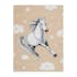 Play Häst är en tvättbar matta med motiv av en häst som ståtligt galopperar fram. På en ljus botten finns en tjusig häst som omges av moln och stjärnor. Som en tavla ligger den stilla på golvet med sin gelbaksida när man galopperar fram i rummet. Perfekt matta för den hästtokiga!