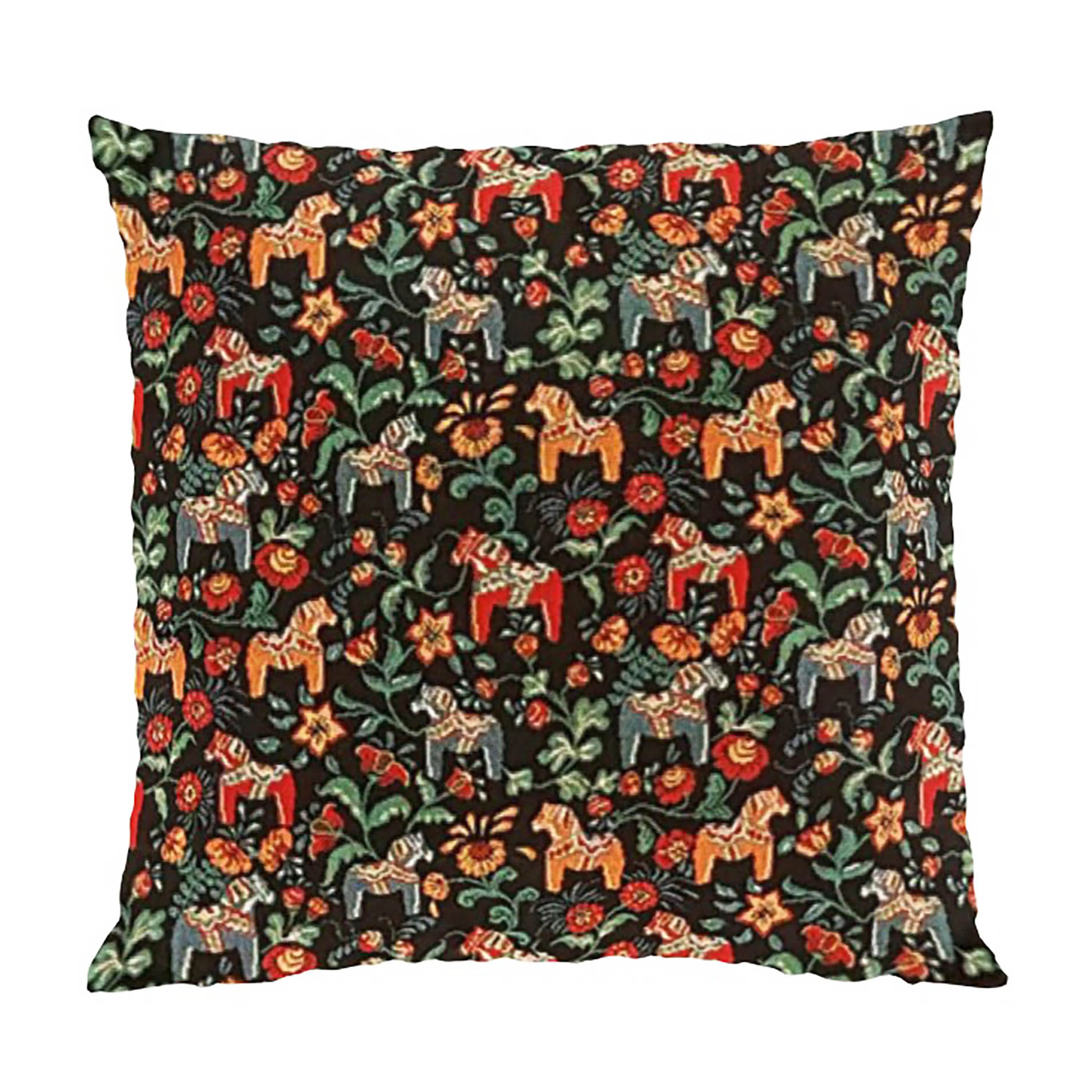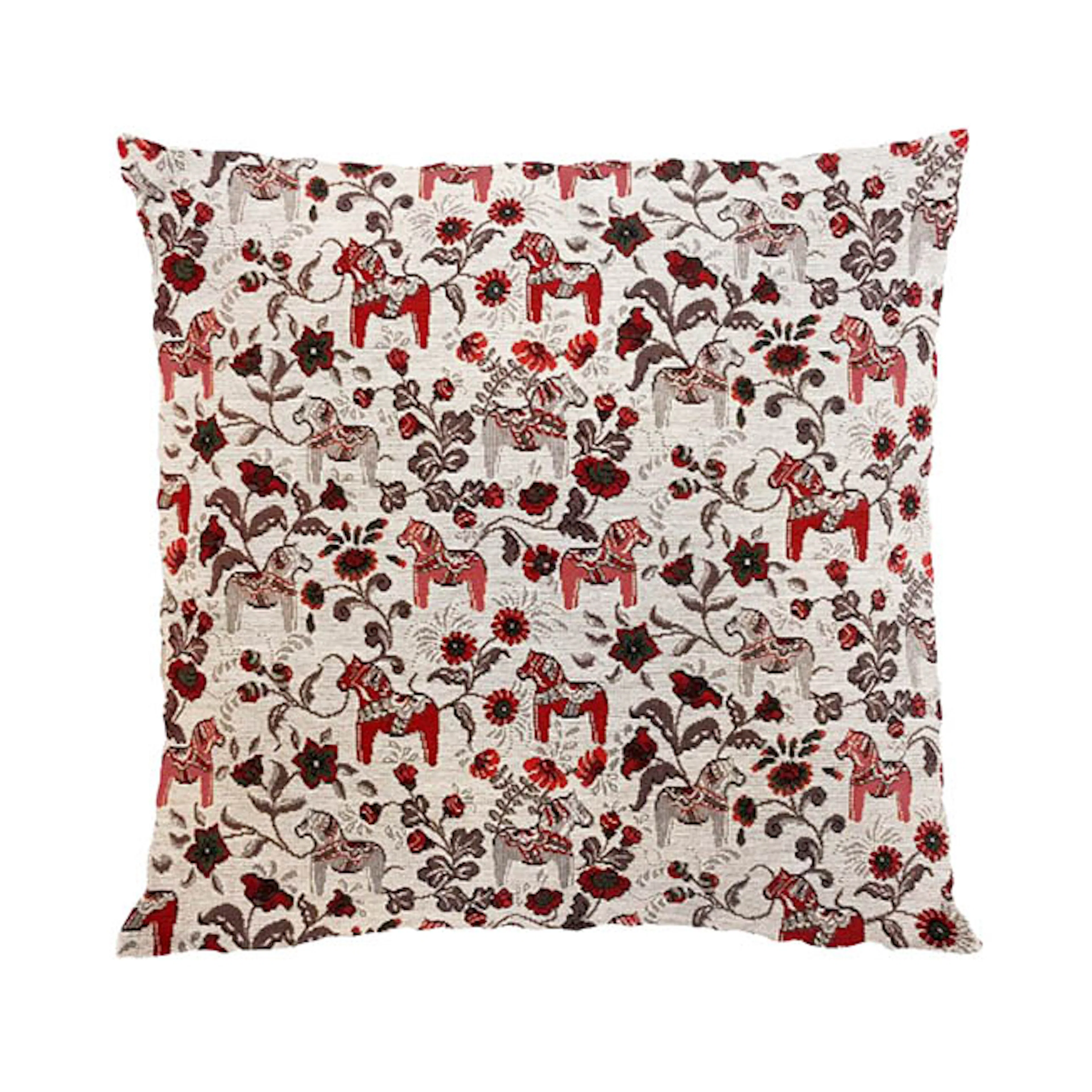 Kuddfodral från Arvidssons Textil. Svenskdesignat mönster av Carola Bengtsson-Malmström. Med dalahästar och kurbitsmotiv i glada färger.