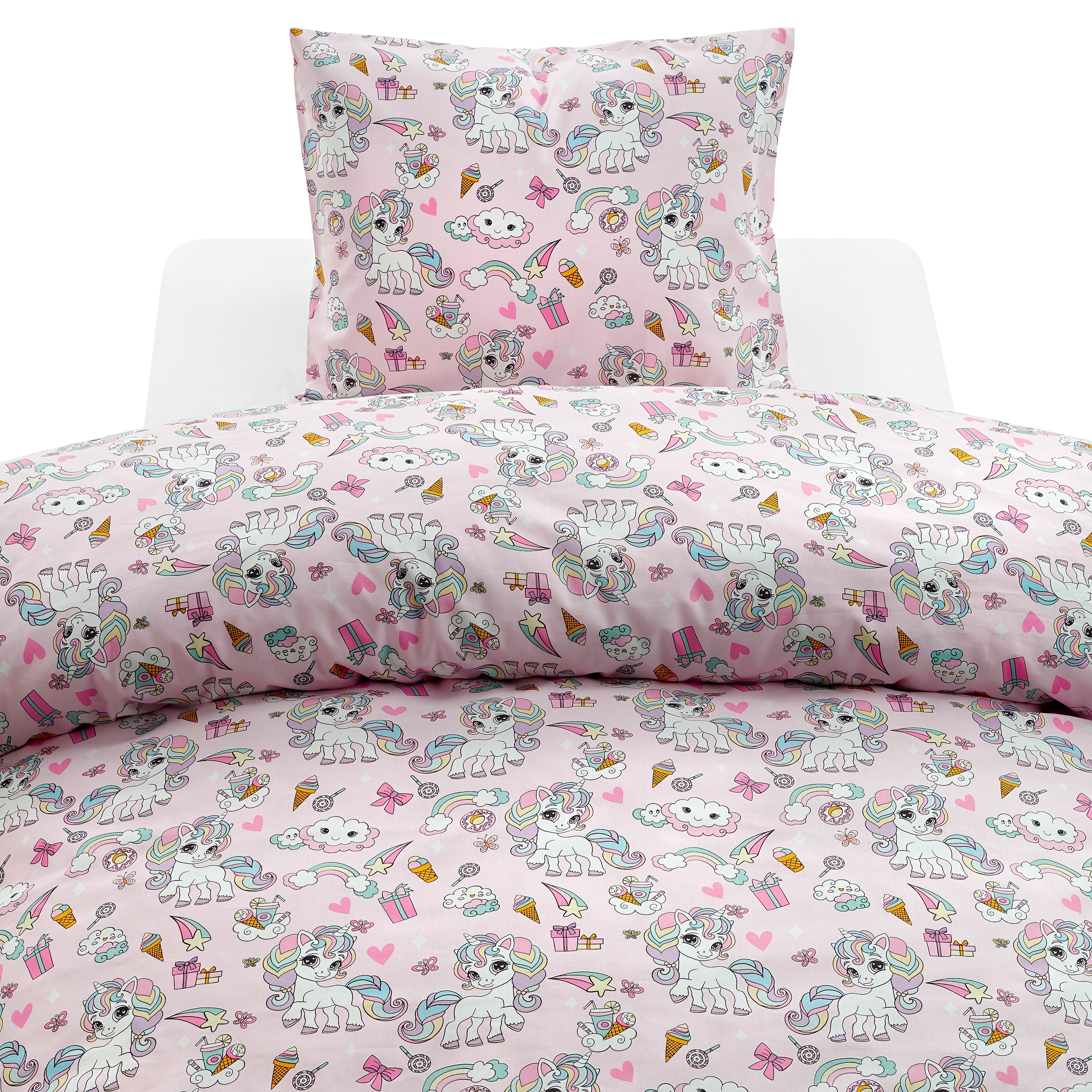 Borganäs bäddset med enhörningsmönster. Ett påslakan (150x210 cm) och ett örngott (50x60 cm), tillverkat av 100% bomull.
