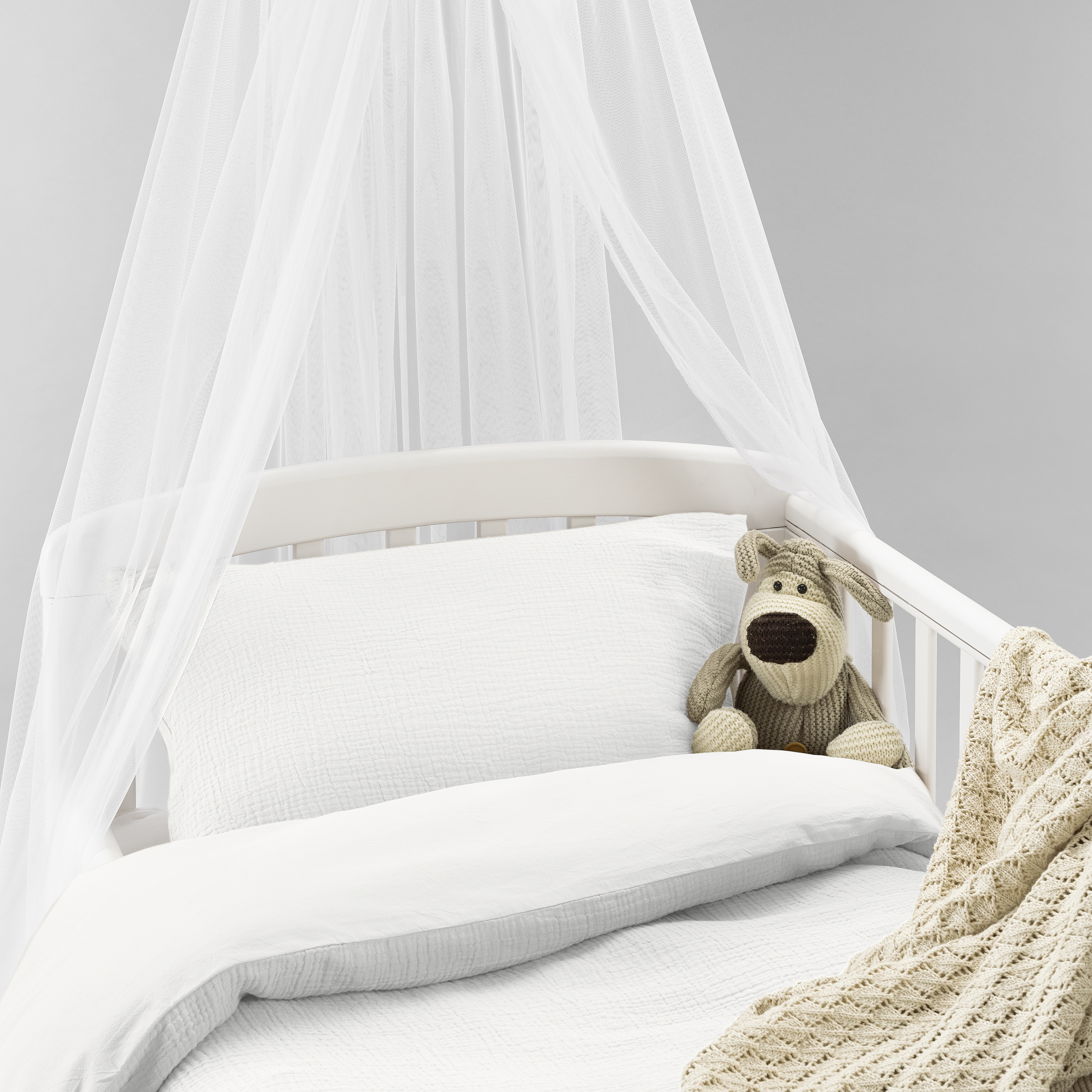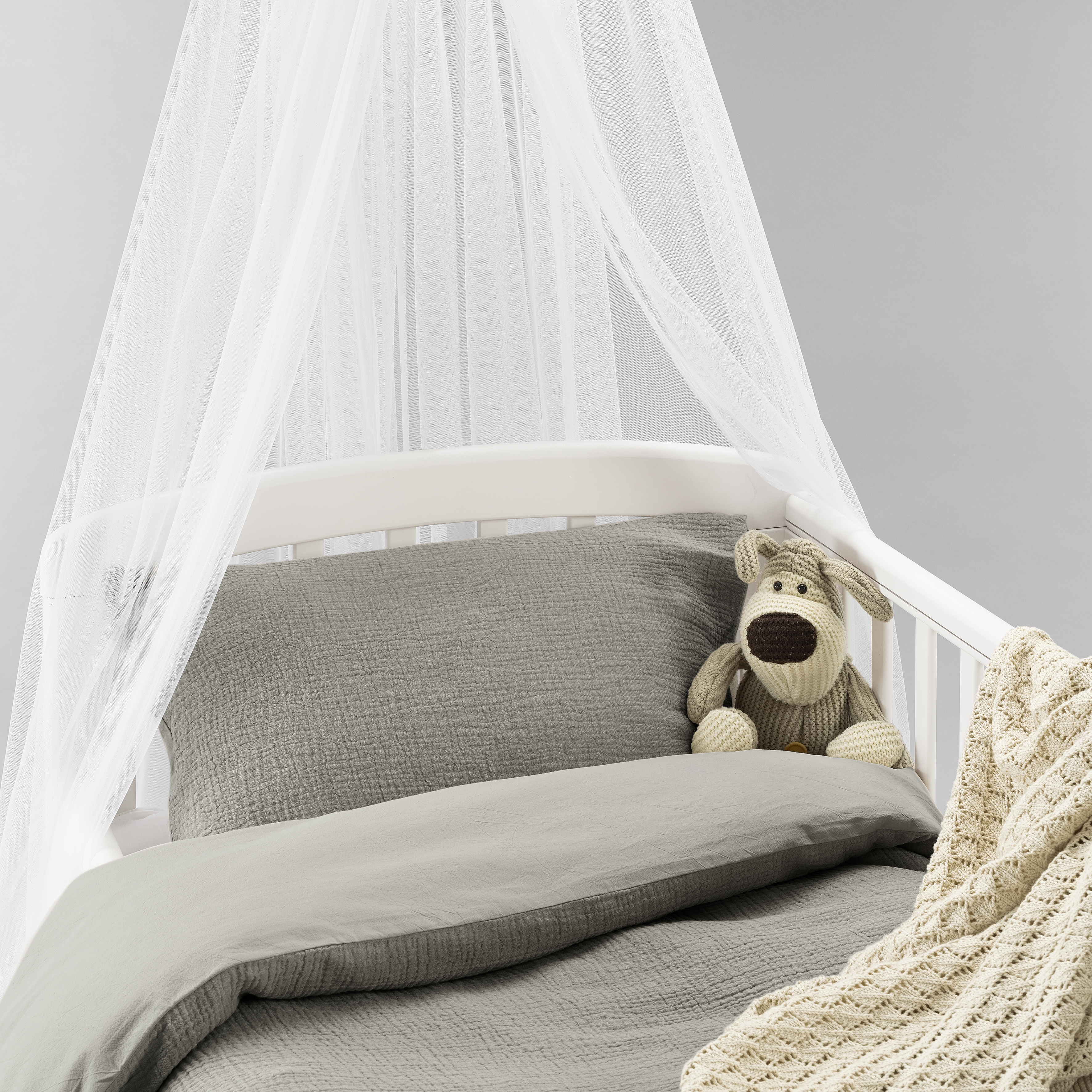 Bäddset bestående av ett örngott och ett påslakan med en krinklad framsida och slät baksida. Tillverkade i fin bomullspercale som känns svalt och skönt att sova i. Passande storlek för spjälsäng.