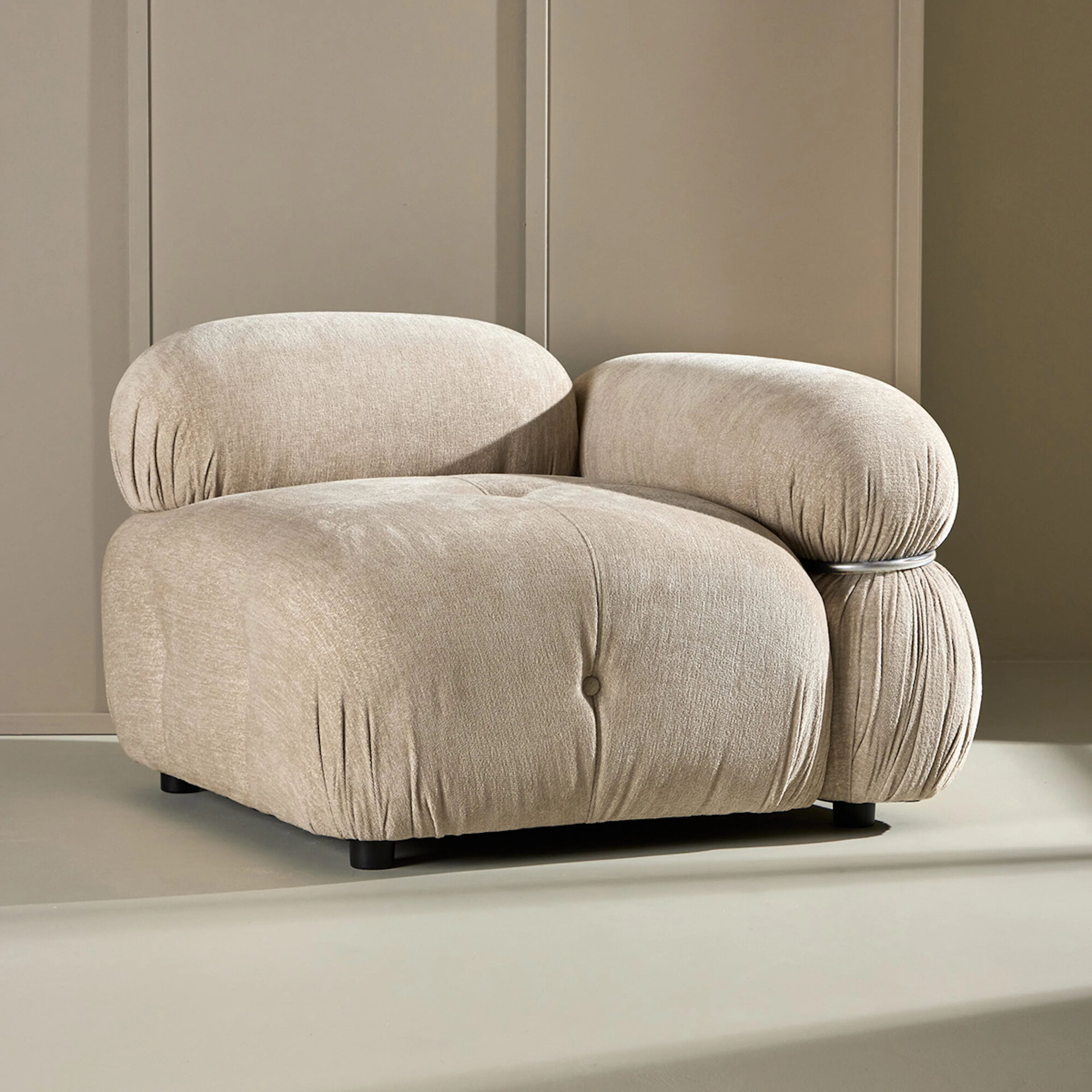 Utforska den mångsidiga och eleganta modulsoffan Mika, en perfekt lösning för dig som vill skapa en skräddarsydd och stilren sittplats i ditt hem. Denna modulära soffa är klädd i en mjuk och inbjudande beige färg, som enkelt smälter in i alla typer av inredningsstilar, från modern minimalism till klassisk elegans.