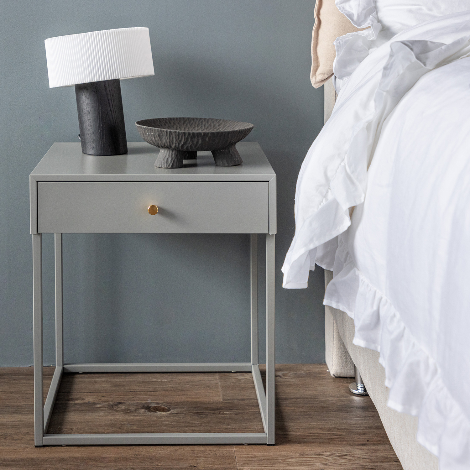Med en magisk kombination av tidlös design och nordisk inspiration kommer detta stilrena sängbord att förvandla ditt sovrum till en plats av både modemedvetenhet och ordning. Sängbordet har en smart låda för dold förvaring med en vacker mässingsfärgad knopp som blir pricken över i:et. Förvara din kvällsbok, glasögon eller småskatter på ett smidigt sätt nära till hands.