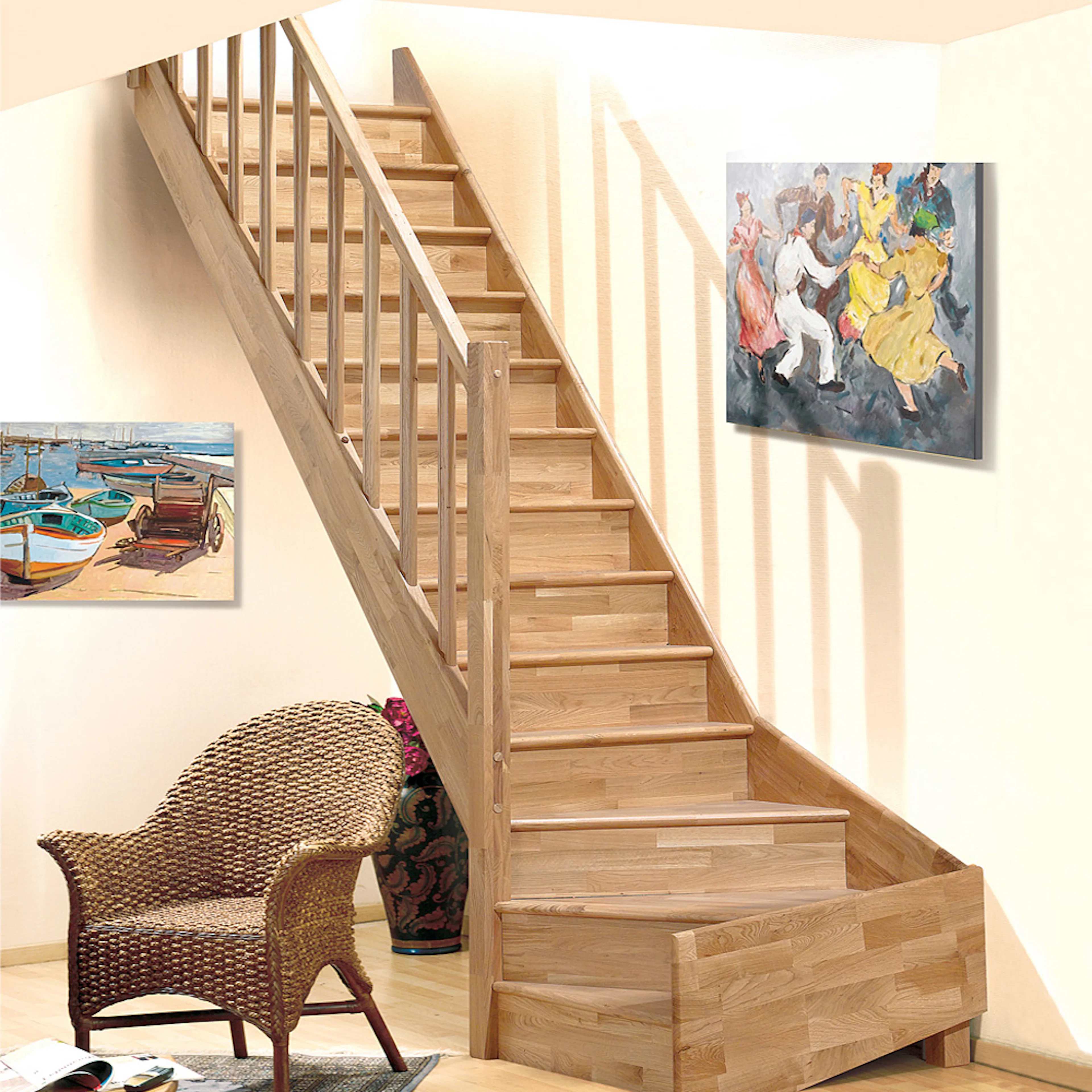 Lofttrappa för trånga utrymmen med massiva sättsteg.
