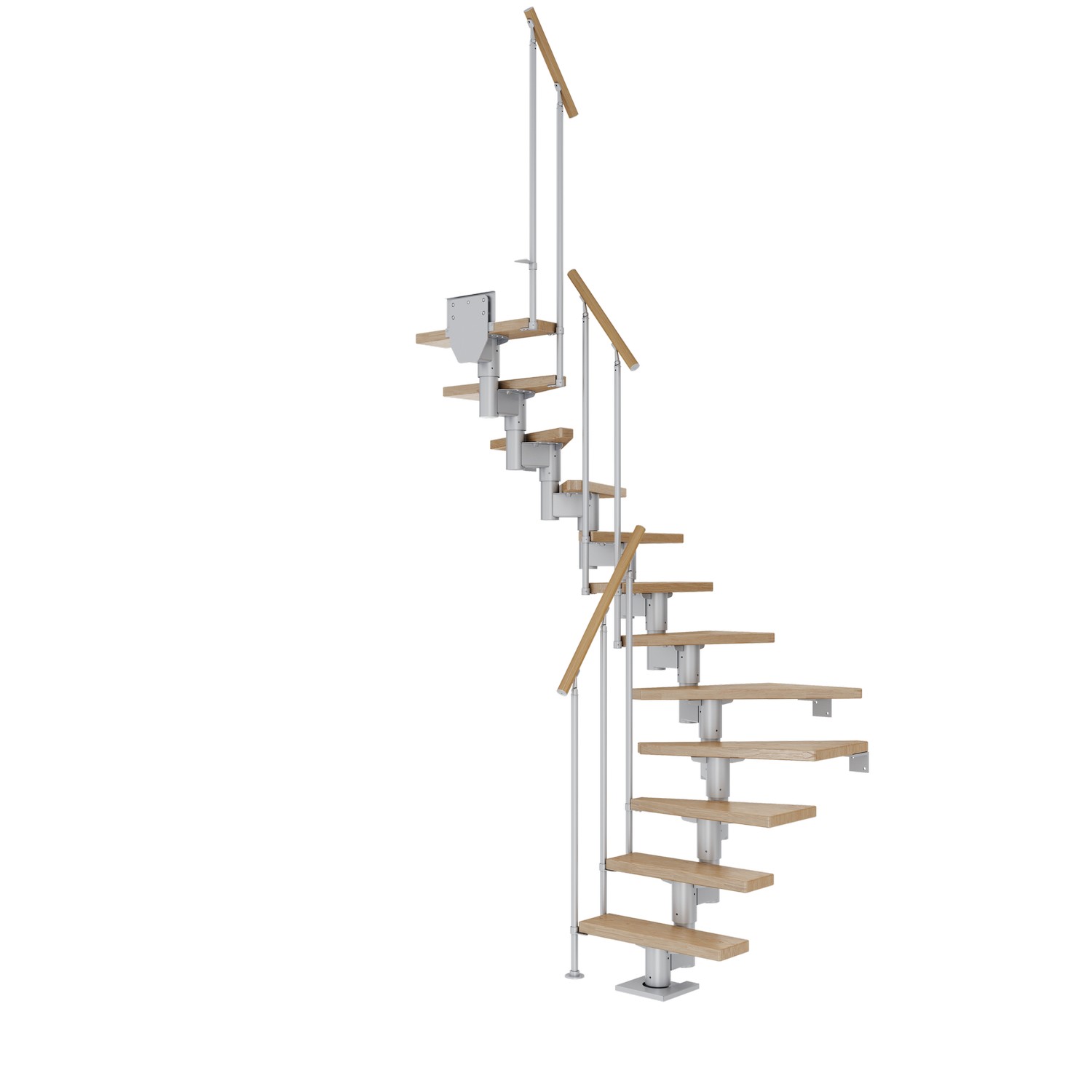 11-15 massiva trästeg ingår som ger en maximal golv-till-golvhöjd på 360 cm. Vid 13-15 steg är det nödvändigt att installera stödstolparna som ingår i paketet. Om golv-till-golvhöjden inte är nödvändig avlägsnas steg helt enkelt tills önskad höjd nås. Trappans ytor är otroligt slitstarka, tål repor och är lätta att underhålla tack vare den halvblanka ytan. Höjden på varje steg kan justeras mellan 18,5 och 22,5 cm.