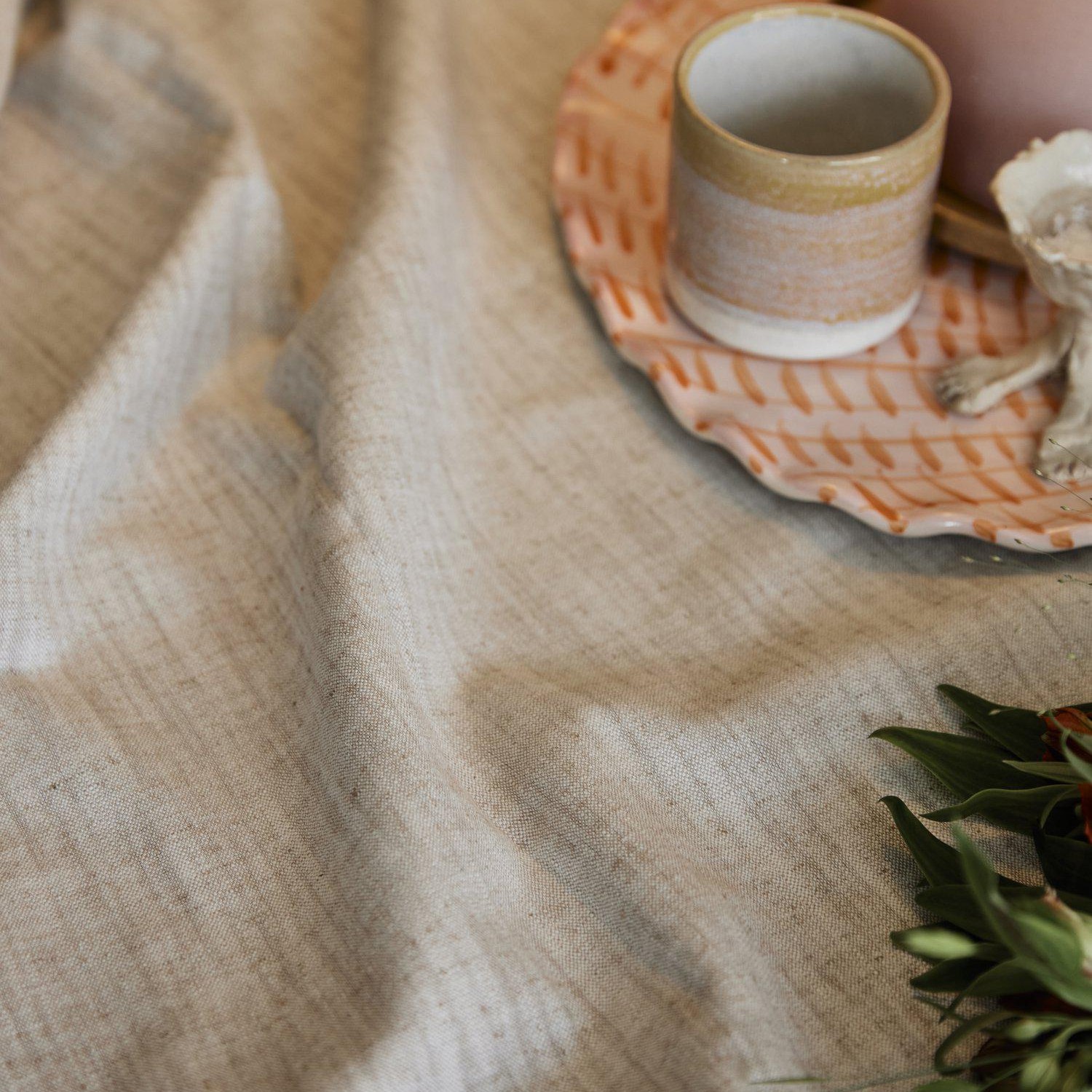 Rund duk i bomull/linneblandning. Tyget är vävt med enchambray som ger ett linneliknande utseende. Duken är 200cm i diameter och passar för det stora runda bordet. Duka gärna med matchande tygservetter och addera en bordsfilt under duken för en riktig lyxig dukning. Produkten är certifierad enligt STANDARD 100 by OEKO-TEX®. Certifieringen garanterar att produkten är testad och fri från ämnen som kan vara skadliga för hälsan och miljön.