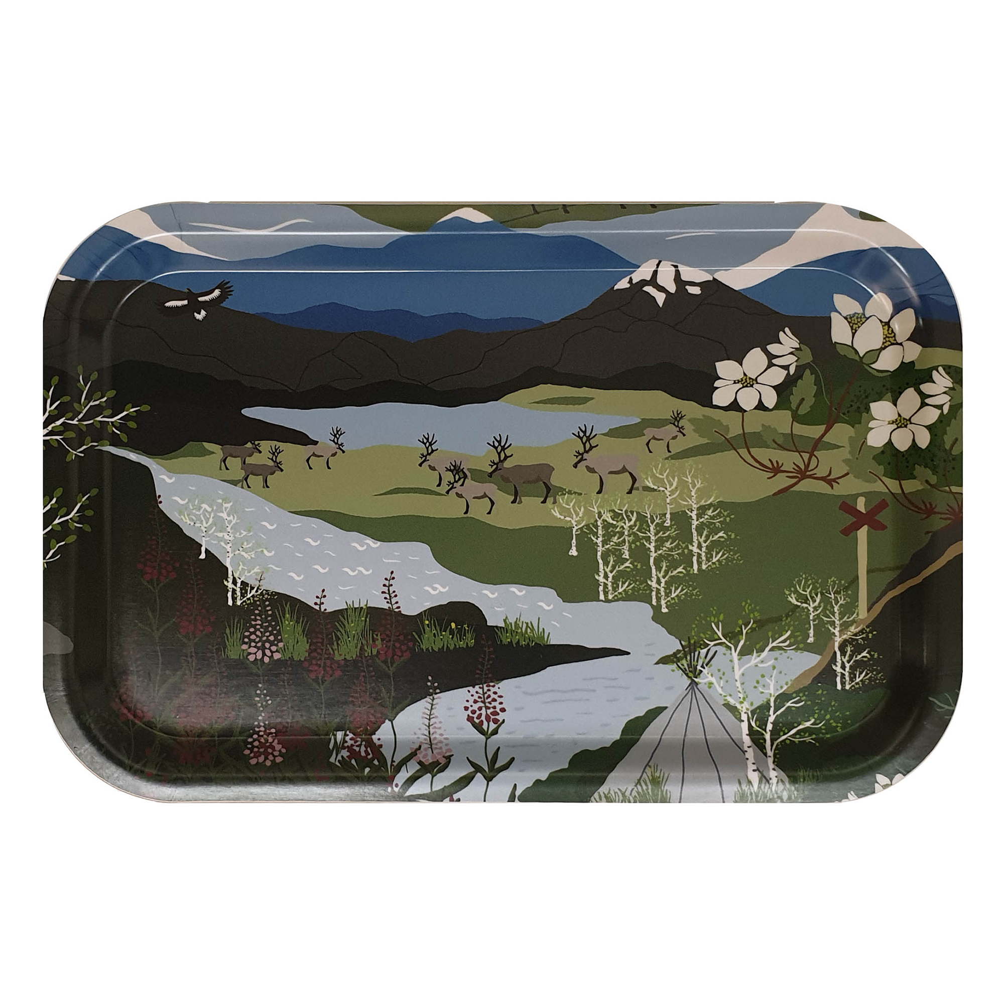 Bricka Fjällvandring från Arvidssons Textil. Svenskdesignat mönster med motiv av härliga fjällandskap med renar och solnedgången. Tillverkad i Sverige. Design av Louise Videlyck.