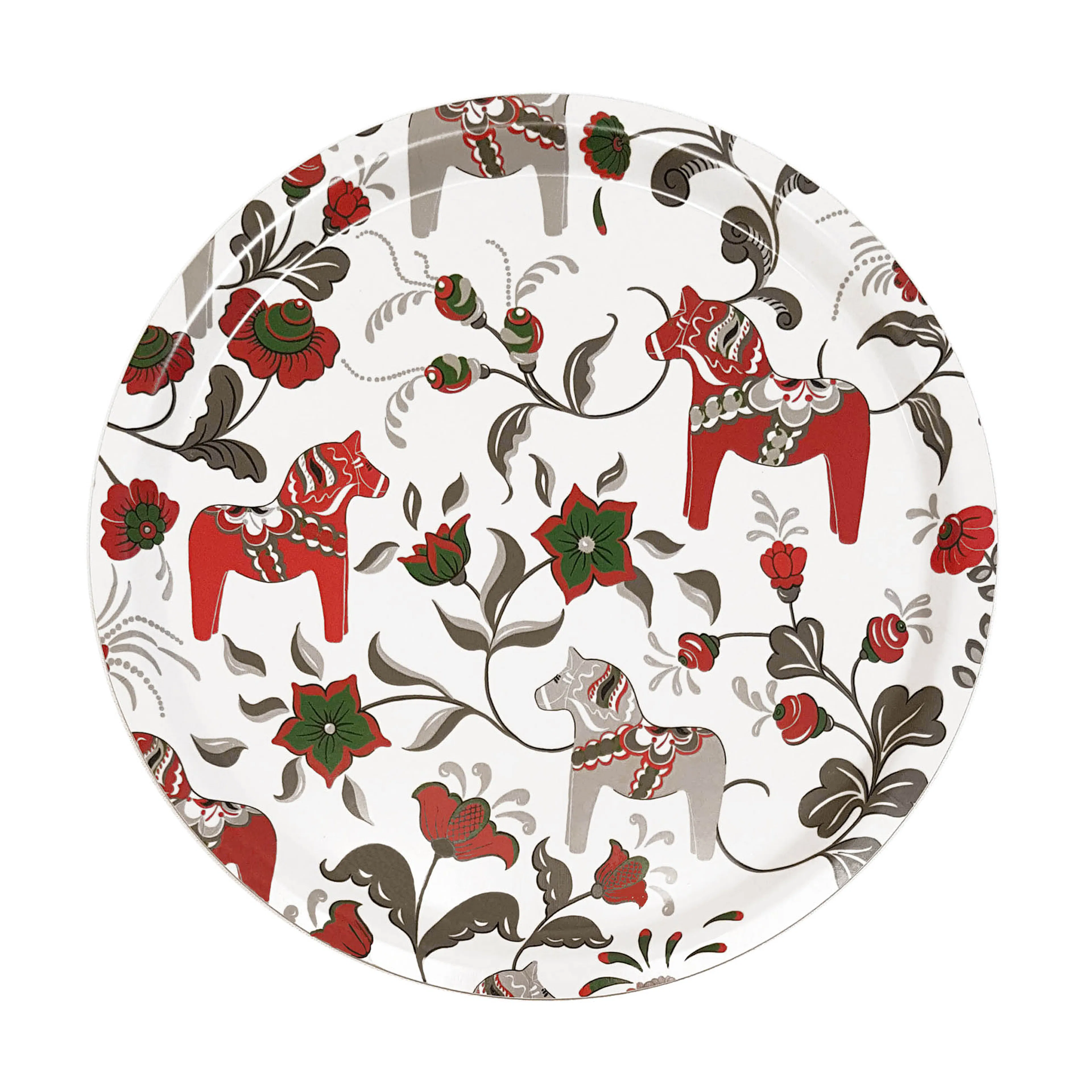 Rund bricka från Arvidssons Textil. Svenskdesignat mönster av Carola Bengtsson-Malmström. Med dalahästar och kurbitsmotiv i glada färger. Tillverkad i Sverige.