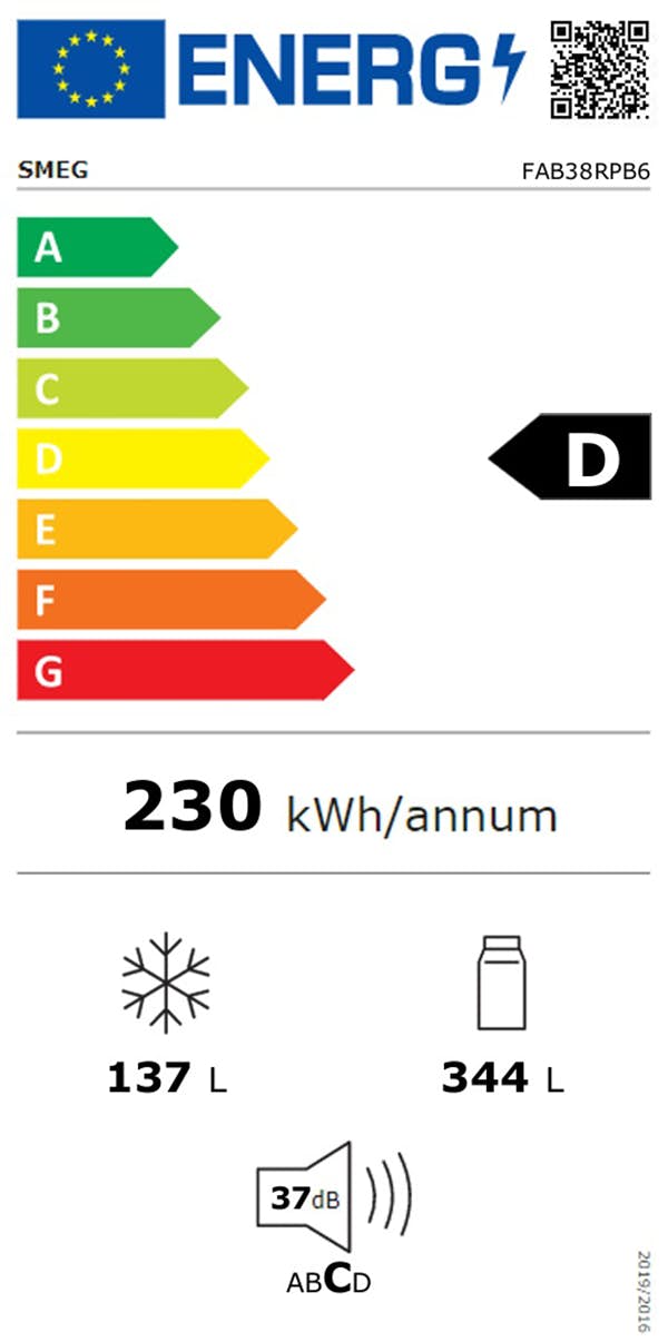 Med en inverterkompressor, köldmedium R600a och ett årligt energibehov på endast 230 kWh är FAB38RCR6 både tyst och energisnål. Ljudnivån är så låg som 37 dB(A), vilket gör att skåpet knappt märks i ett öppet kök. Energiklassen är D enligt den nya energimärkningen och bullerutsläppet klassas i kategori C.