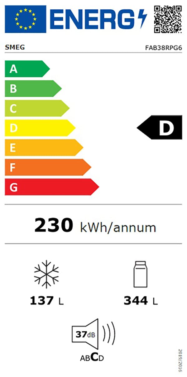 Med en inverterkompressor, köldmedium R600a och ett årligt energibehov på endast 230 kWh är FAB38RCR6 både tyst och energisnål. Ljudnivån är så låg som 37 dB(A), vilket gör att skåpet knappt märks i ett öppet kök. Energiklassen är D enligt den nya energimärkningen och bullerutsläppet klassas i kategori C.