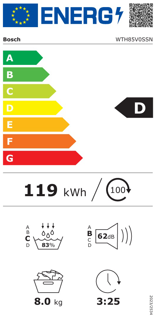 Genom att använda energibesparande hushållsapparater sparar du på värdefulla resurser. Det är därför du bör tänka på låg energi- och vattenförbrukning när du köper en hushållsapparat. Energimärkningen anger effektivitetsklass, ljudnivå, kapacitet, energi- och vattenförbrukning för den aktuella produkten. Den viktigaste förändringen i de nya energimärkningarna är elimineringen av energieffektivitetsklasserna som till exempel A+++. Den nya effektivitetsklassen kommer att vara från A till G för tvättmaskiner. Tack vare Boschs högeffektiva energisparsystem uppnår Bosch tvättmaskiner den bästa energiklassen A utan att kompromissa med resultatet.