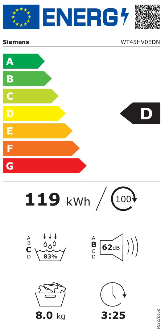 Siemens iQ300 WT45HV0EDN är en energieffektiv värmepumpstumlare med 8 kg kapacitet och energiklass A++ som ger resurssnål och skonsam torkning Med iSensoric-teknologi och autoDry-funktion anpassas torktiden automatiskt genom fukt- och temperatursensorer vilket skyddar kläderna och förhindrar övertorkning