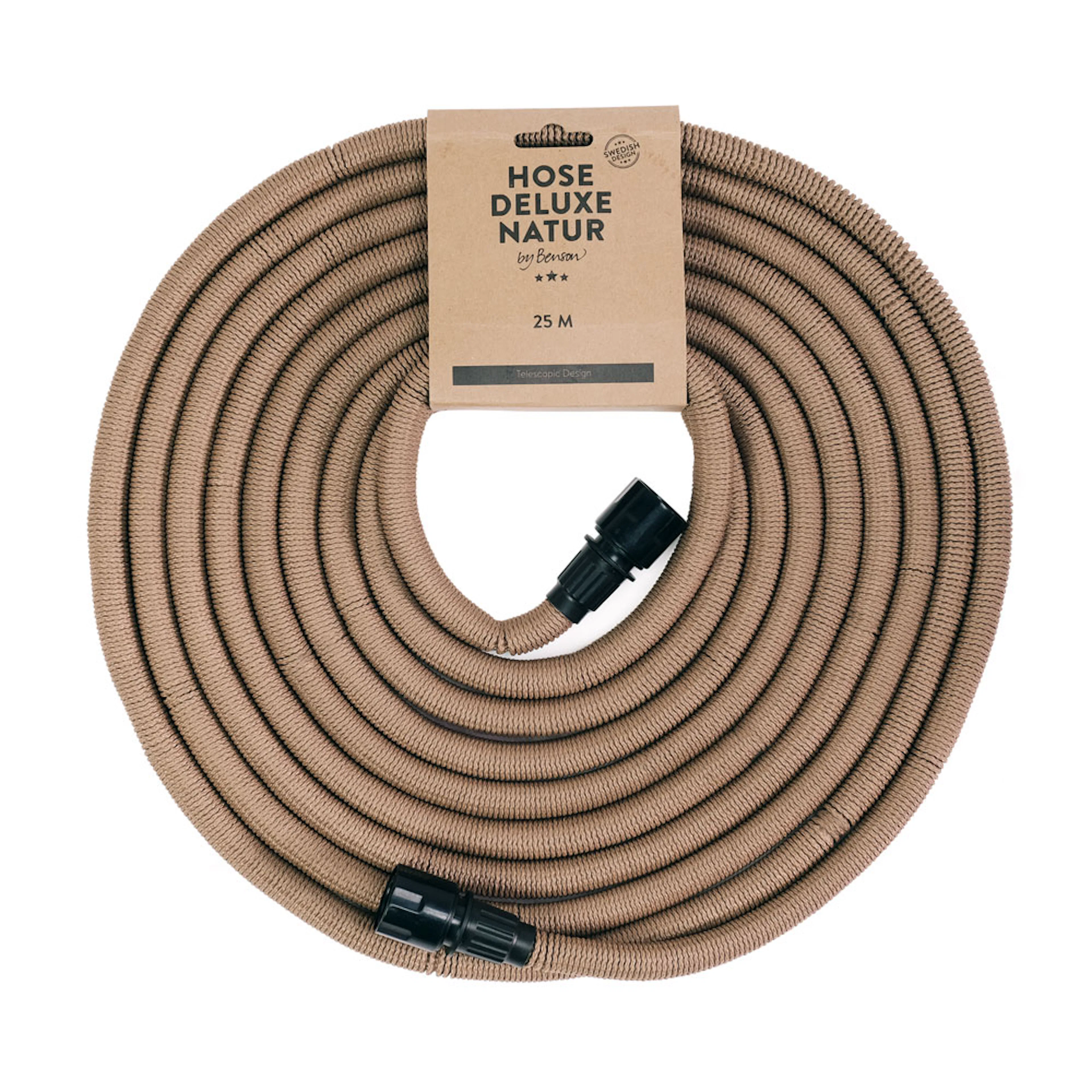 Vattenslang Deluxe 25m med tillhörande strålpistol samt slanghängare och praktisk påse i sammet. Slangen är tillverkad av mycket slittålig textil och inuti en slang i latex.