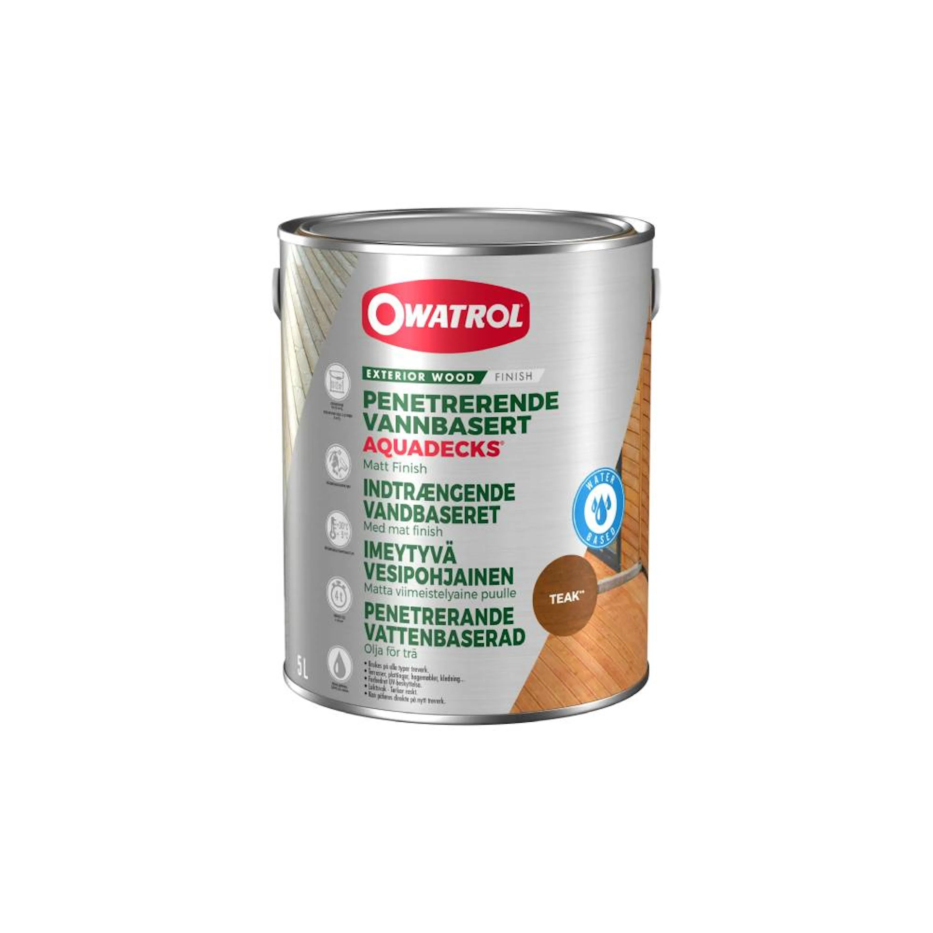 Träolja Aquadecks från Owatrol. En penetrerande, vattenbaserad olja som ger en långvarig matt finish till alla typer av trä. Klar att använda, torkar snabbt och doftar endast svagt. För terrasser, bryggor, foder, staket etc.