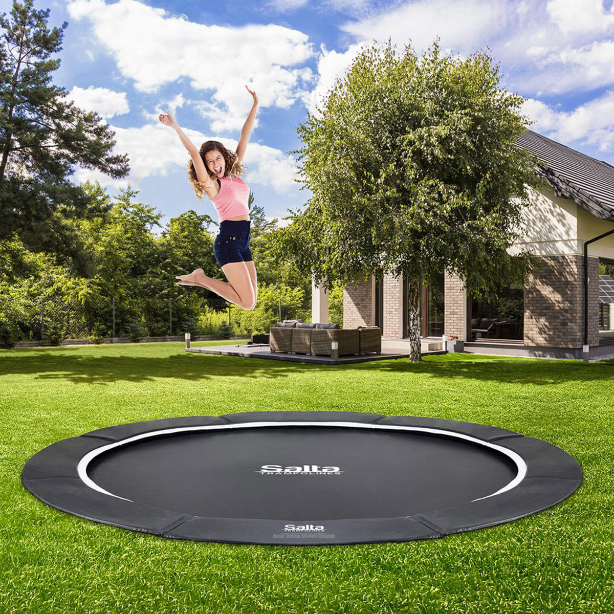 Studsmatta från Salta monteras i samma höjd som gräsmattan och blir då helt integrerad i din trädgård. Det specialutvecklade "Air Performance System" gör att luftströmmen är helt optimerad. Denna funktionalitet är avgörande för nedgrävda studsmattor och ger den perfekta hoppkomforten. Detta ger studsmattan en enastående hoppupplevelse, och tack vare detta system är studsmattan även mycket tyst. Säkerhetsnät ingår ej, ska köpas till om studsmattan ska användas av barn.