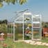 Det har praktiskt taget okrossbara polykarbonatpaneler med dubbla väggar och en kraftig grön pulverlackerad, rostbeständig aluminiumram. Mythos har en låsbar gångjärnsdörr med magnetlås, en takventil, rännor och en bas av galvaniserat stål för bättre stabilitet, inriktning och ytterligare höjd.