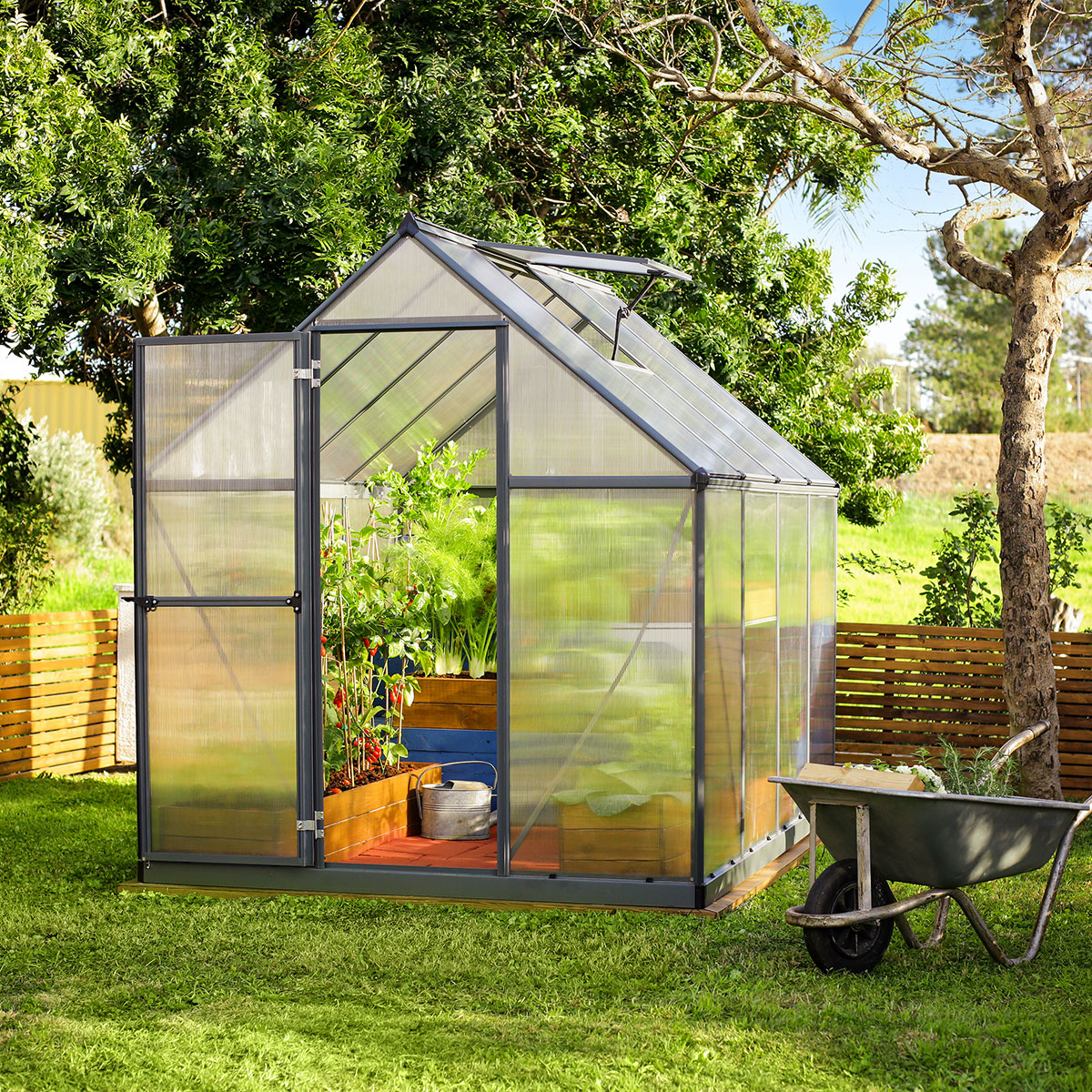 - Praktiskt taget okrossbart växthus med dubbla väggar i polykarbonat som upprätthåller idealiska temperaturer och skyddar mot starkt solljus, ger över 70 % ljustransmission