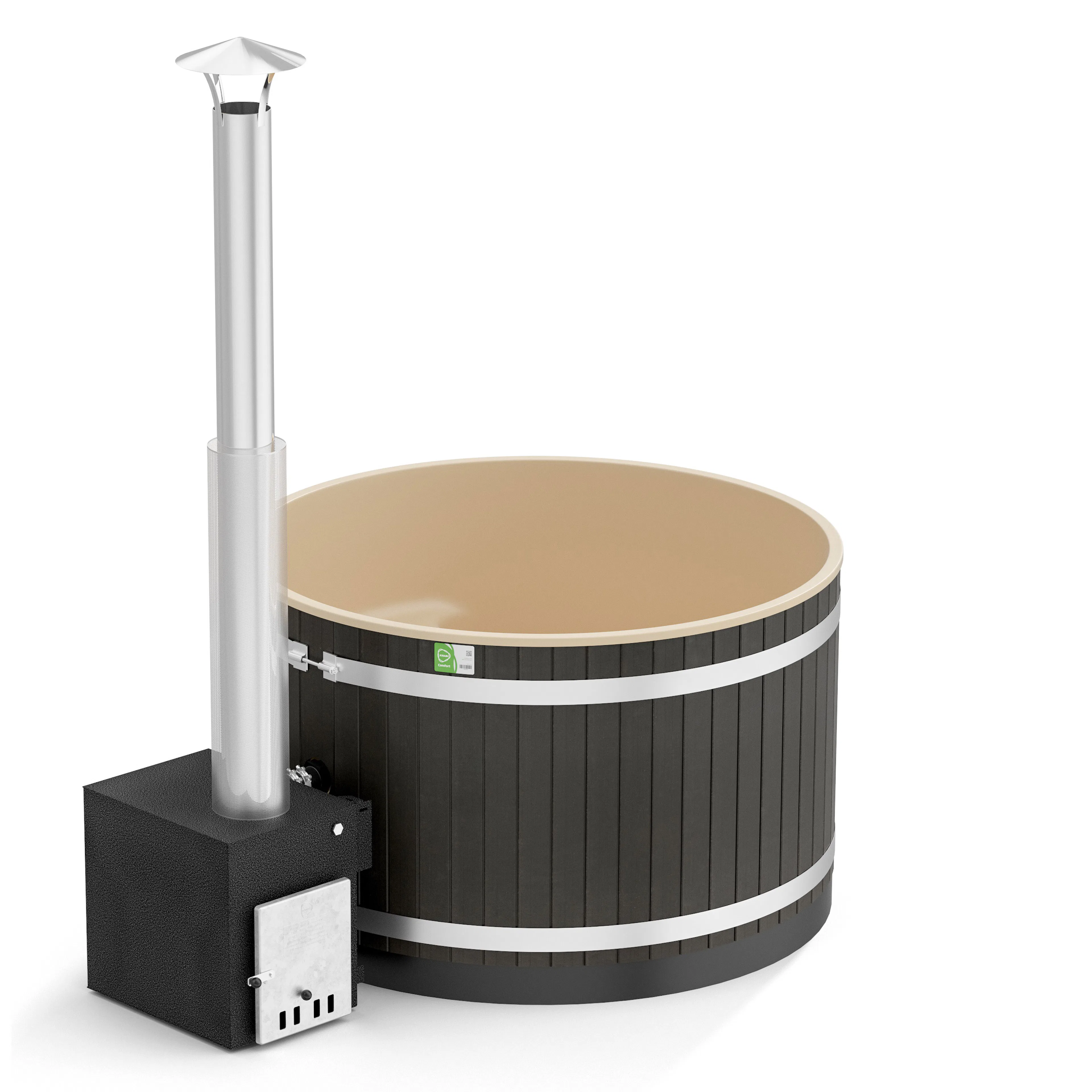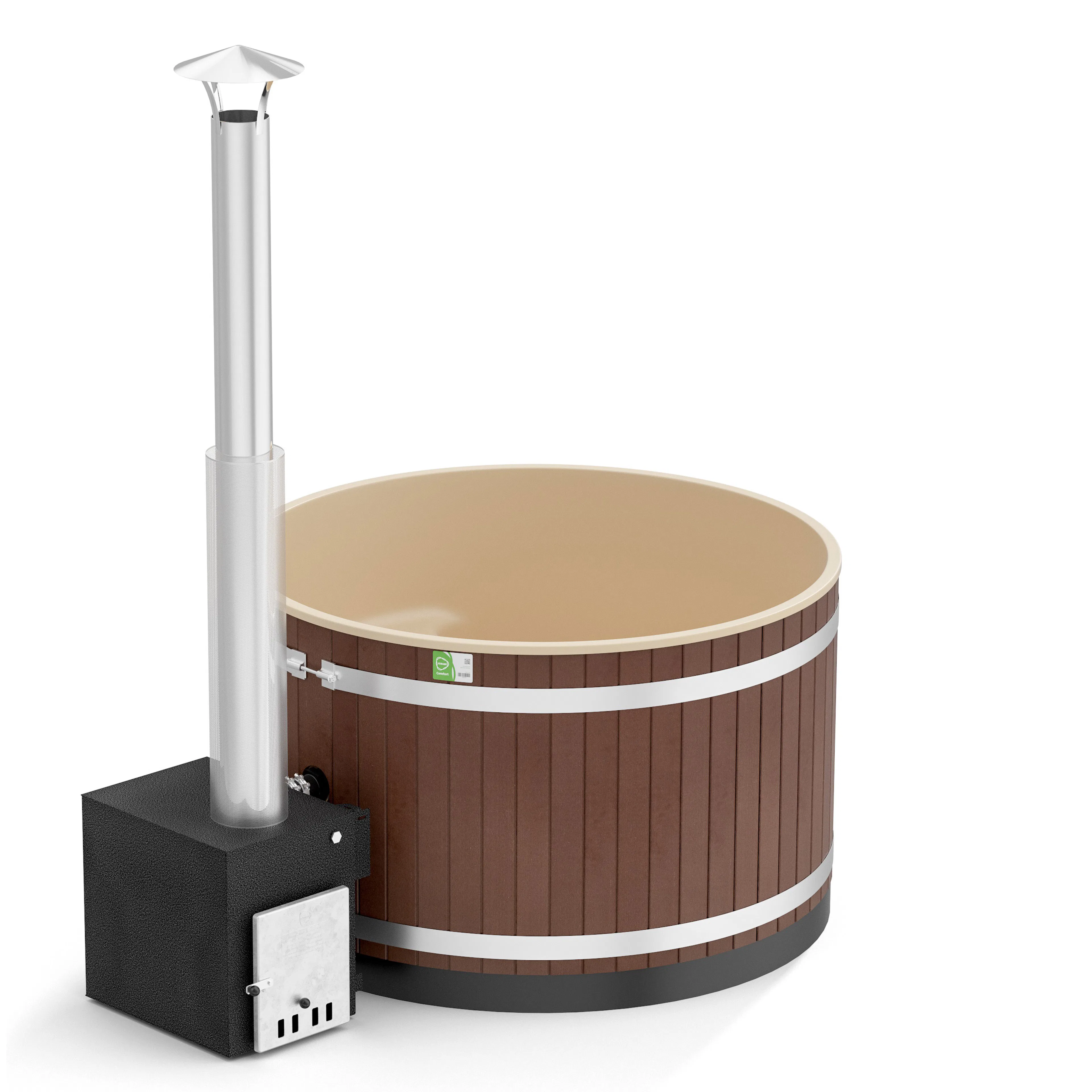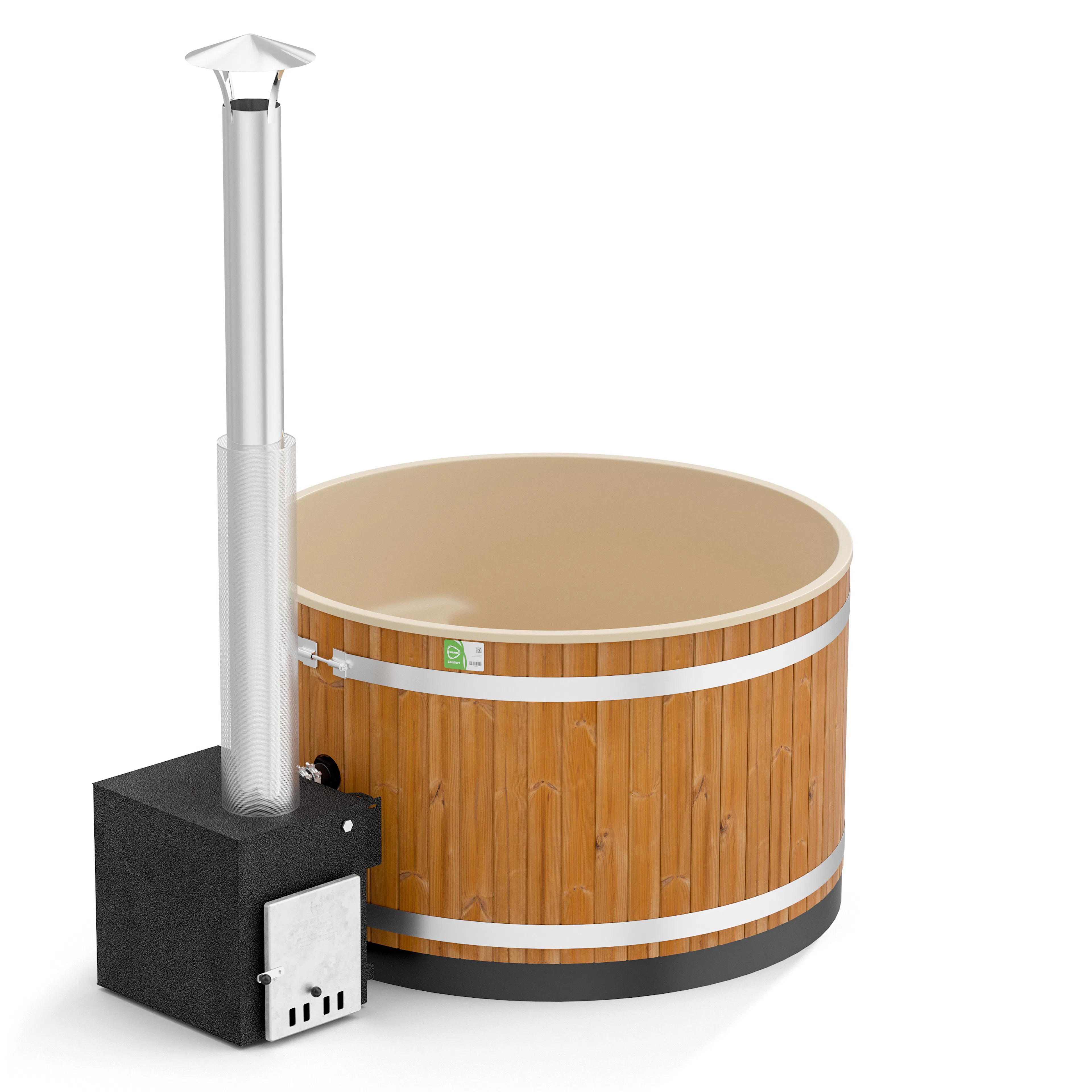 Med den externa vedkamin Cube, 48 kw som har en nettoeffekt på 35 kW så värms badtunnan normalt upp, 4-38°C på lite drygt 1,5 timmar när man eldar med bra ved, björk. Samt att man har täcklocket och ett extra isolerande underlock som håller värmen kvar under vattnet, (tillbehör). Uppvärmningstiden blir normalt längre vintertid, då man kan räkna med närmare 2 timmar med denna vedkamin. Vedkaminen rymmer mycket ved och klarar av upp till 57 cm lång ved. Vedkaminen är grundutrustad med 2 meters stadig rostfri syrafast modulskorsten och 1 meters värmeskydd samt en ordentlig skorstenshatt som hindrar regn. Skorstenen kan enkelt och stadigt förlängas med fler 1 meters skorstensmoduler. Eldas björkved så räcker normalt dem medföljande skorstenshatten men eldar man med gran-, tall- eller spillvirke så kan en förlängning av skorstenen och ett gnistskydd vara ett bra alternativ.