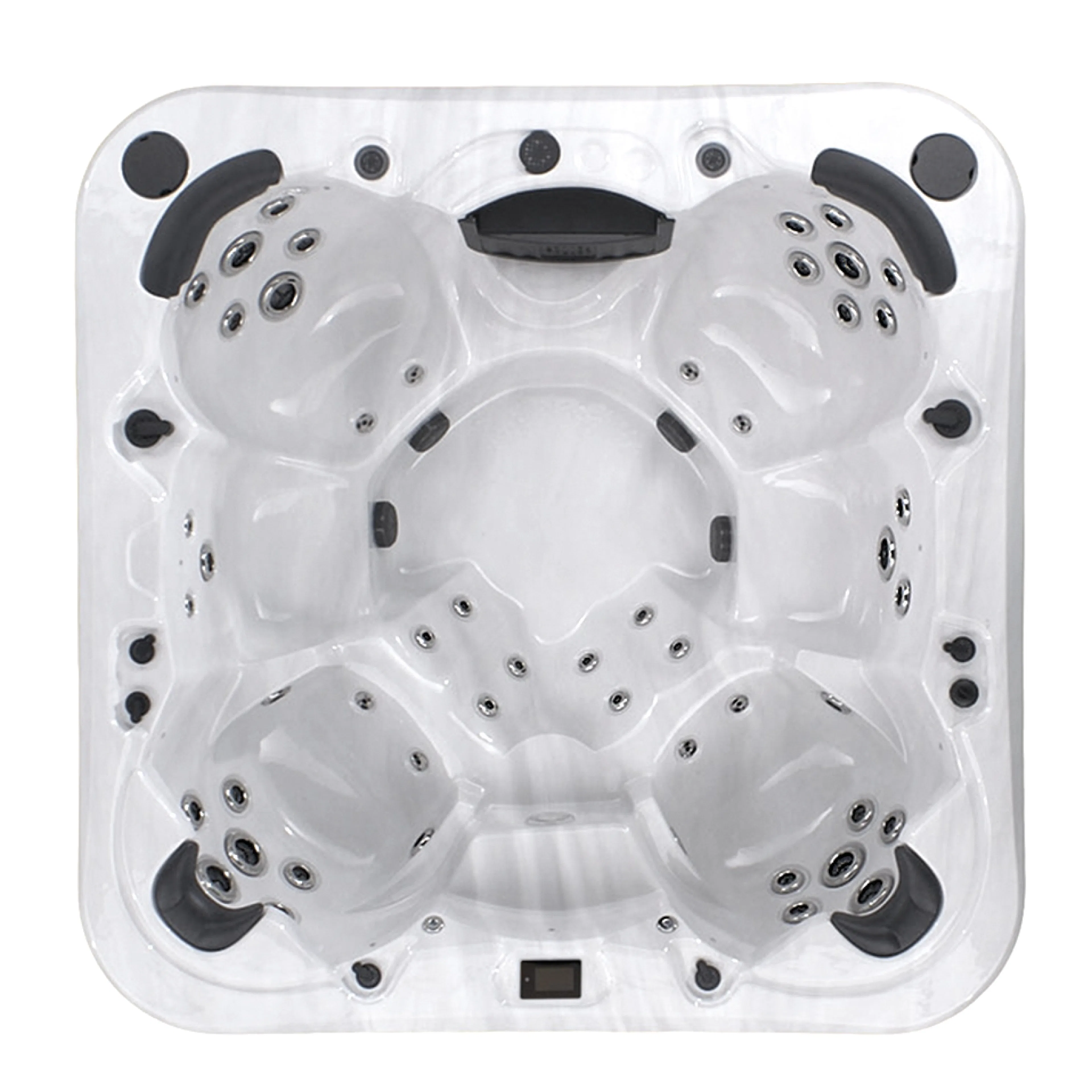 Detta är Swebads enda spabad utrustat med två semilounge säten med riktad nackmassage. Semilounge betyder halvt sittande/halvt liggande. Perfekt läge att avnjuta en helkroppsmassage och samtidigt ge plats åt ytterligare två rymliga hörnsäten och två enklare terapisäten. Totalt 65 masserande jetmunstycken i rostfri design av olika storlekar och utförande. Använd effektvredet för en steglös reglering av jetsens styrka samt reglagevredet till att förflytta kraften i jetsen mellan vissa av sätena.