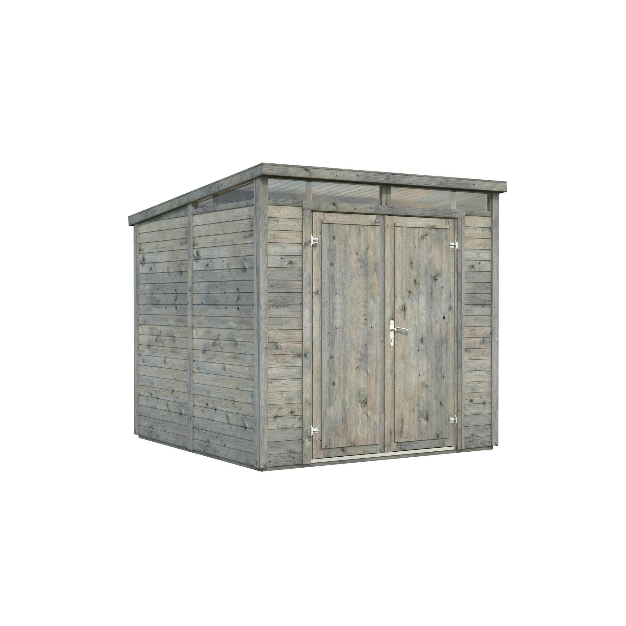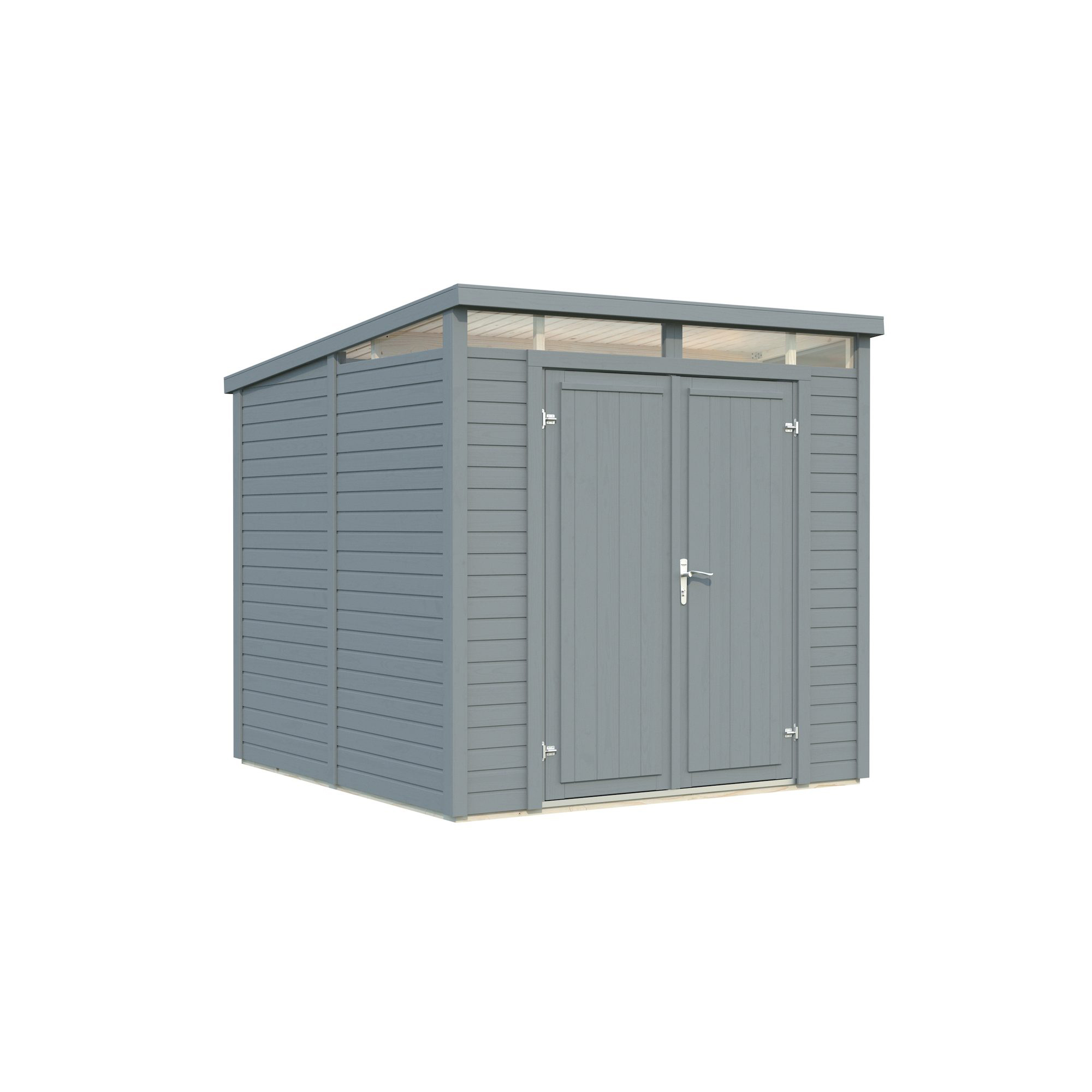 Praktisk redskapsbod med smart design och naturligt ljus. Elias 4,9 m² förråd kombinerar elegant design med praktisk funktionalitet och blir en stilfull tillsats till vilken trädgård som helst. Smala akrylglasfönster placerade under taket släpper in naturligt dagsljus, vilket minskar behovet av konstgjord belysning och skapar ett ljust och inbjudande inre. Den breda dubbeldörren i trä gör det enkelt att förvara större verktyg och utrustning.Byggd av högkvalitativ nordisk gran består förrådet av färdiga väggsektioner med 16 mm horisontell panel för snabb och stabil montering.