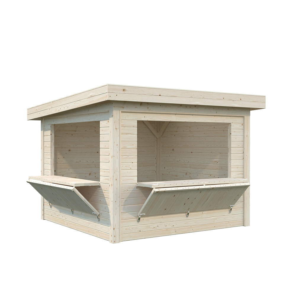 Kiosken är tillverkad av kraftig limträkonstruktion, 19 mm takskiva och 28 mm väggskiva, och är lätt att montera. Tillverkad av nordisk gran med 120x120 mm starka limträstolpar och 19 mm takbrädor. 28 mm vägstockar.