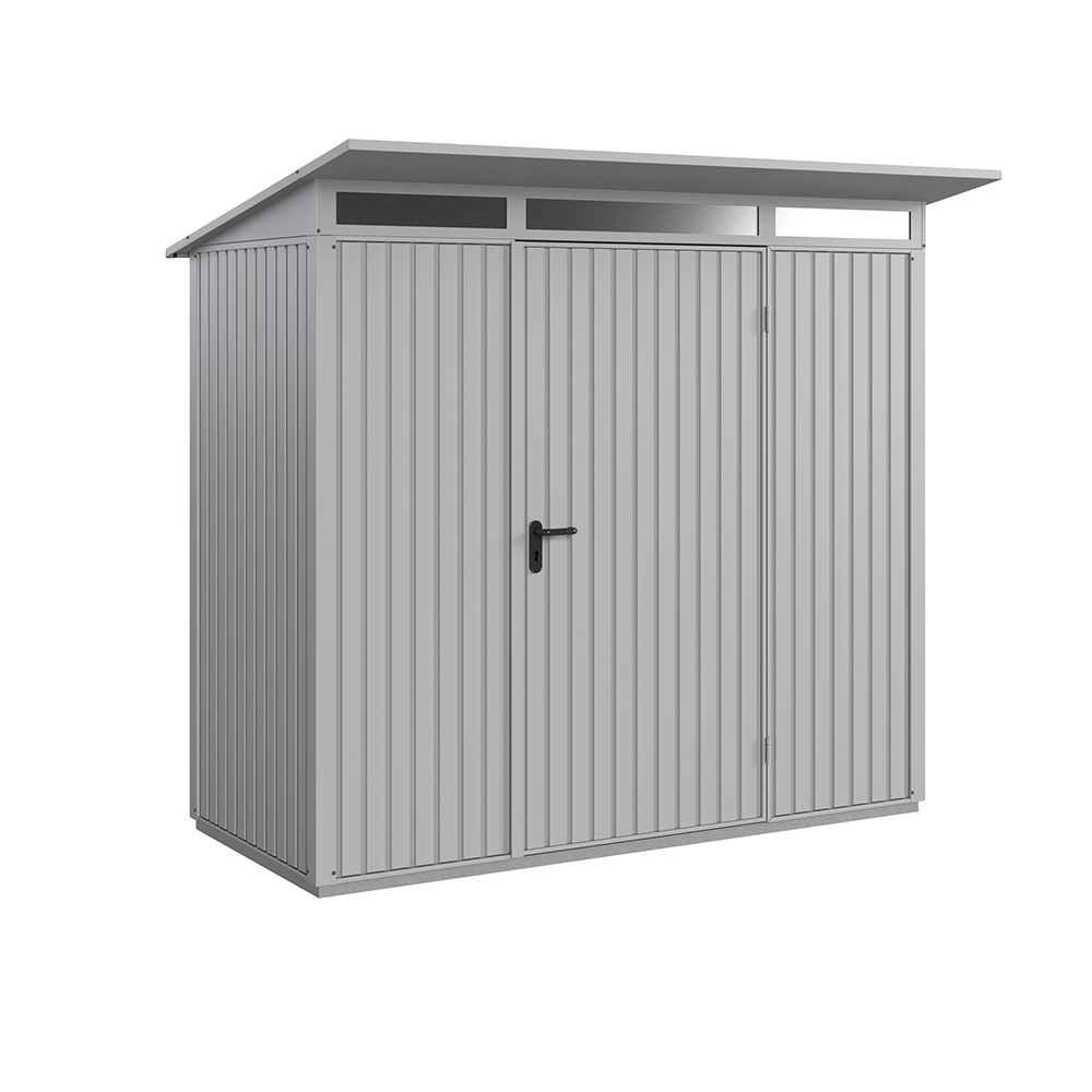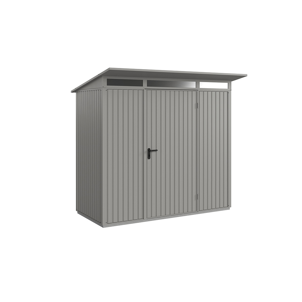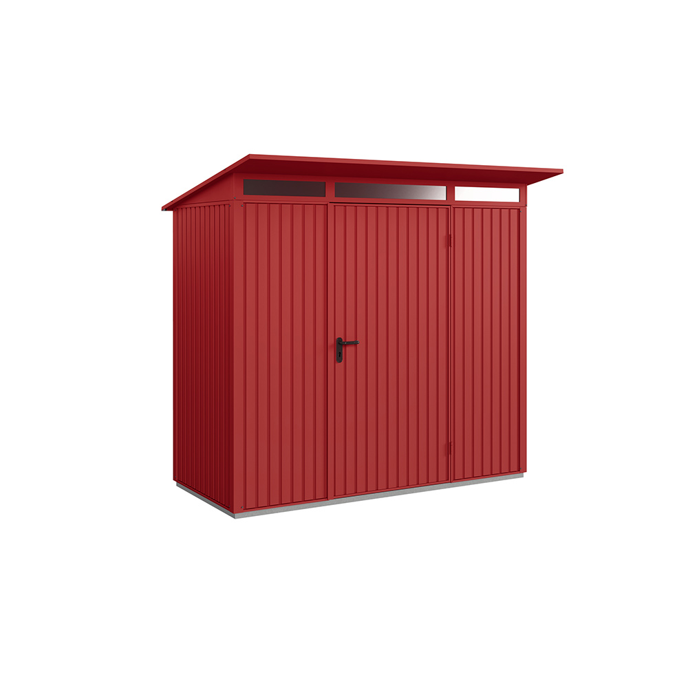 Redskapsbodarna får sin höga stabilitet och slitstyrka av dess stålkonstruktion och den höga materialtjockleken. Grundram i aluminium ingår alltid som standard. Alla skruvar och gångjärn är förzinkade och därmed skyddade mot oxidation. Redskapsbodarna är som standard utrustade med pålitliga dörrlås och högkvalitativa gångjärn. Modellen Modern levereras med integrerat överljus i akrylglas för invändigt dagsljus. Som tillval erbjuds ett stort antal hyllsystem i form av justerbara hyllor, cykelhållare, redskapshållare, belysning, aluminiumgolv mm.