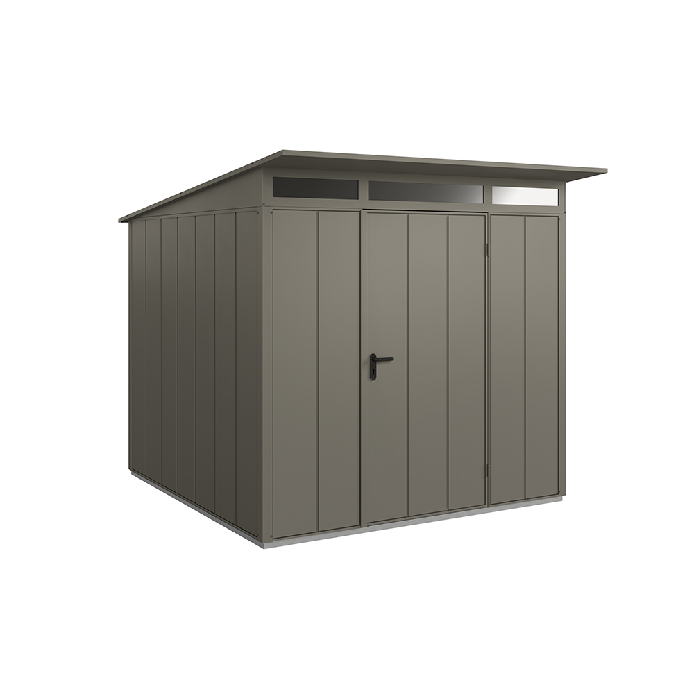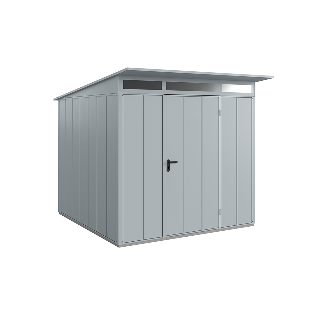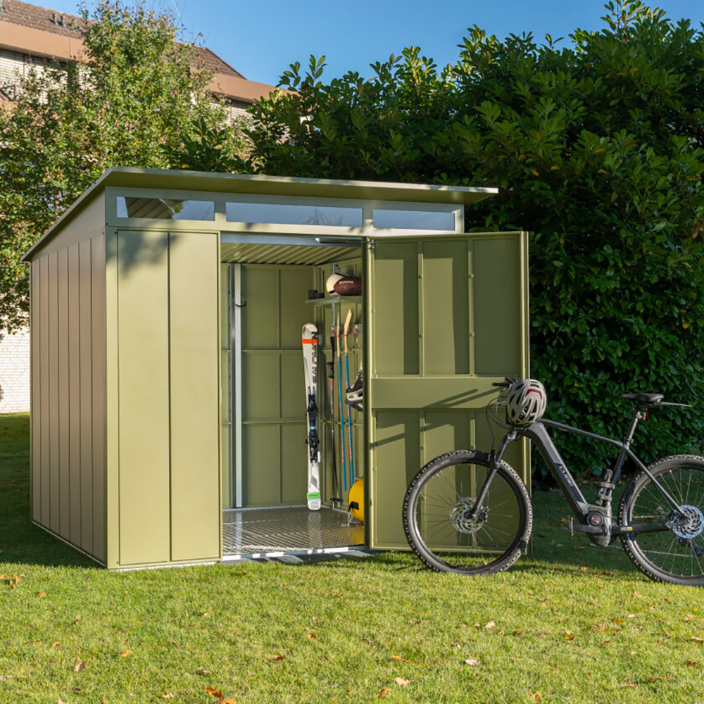 Redskapsbodarna får sin höga stabilitet och slitstyrka av dess stålkonstruktion och den höga materialtjockleken. Grundram i aluminium ingår alltid som standard. Alla skruvar och gångjärn är förzinkade och därmed skyddade mot oxidation. Redskapsbodarna är som standard utrustade med pålitliga dörrlås och högkvalitativa gångjärn. Modellen Modern levereras med integrerat överljus i akrylglas för invändigt dagsljus. Som tillval erbjuds ett stort antal hyllsystem i form av justerbara hyllor, cykelhållare, redskapshållare, belysning, aluminiumgolv mm.