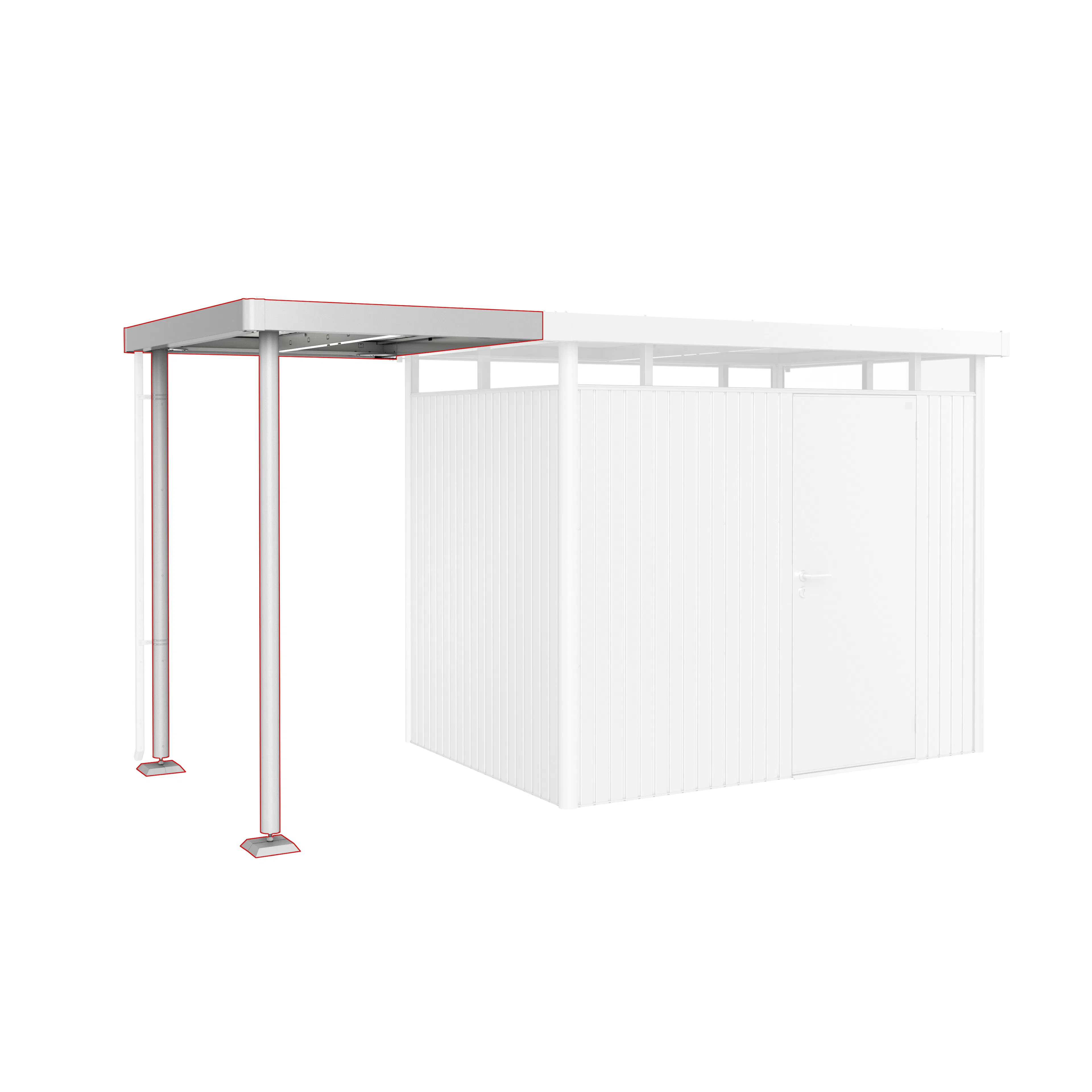 Sidotaket kan fästas på boden HighLine® (från storlek H2 och uppåt) på sidan med hängrännan – antingen på ena eller båda sidorna. Den finns i två olika storlekar. Sidotaket S är 150 cm brett och storlek L är 282 cm. Stödbenen i aluminium är utrustade med fötter som kan justeras i höjdled. Stuprör ingår.