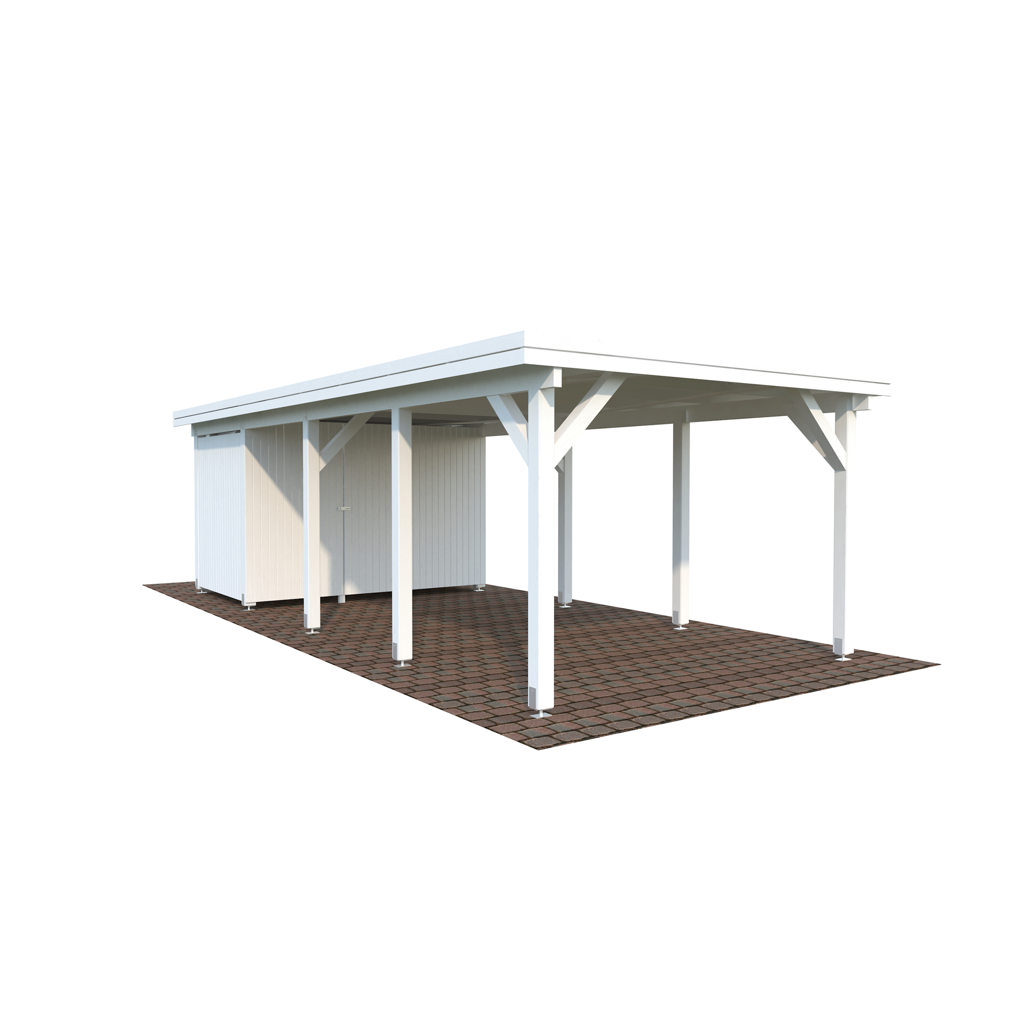 Palmakos Karl 23,1 m² med förråd är en klassisk carport med flackt tak som ger den ett modernt utseende.