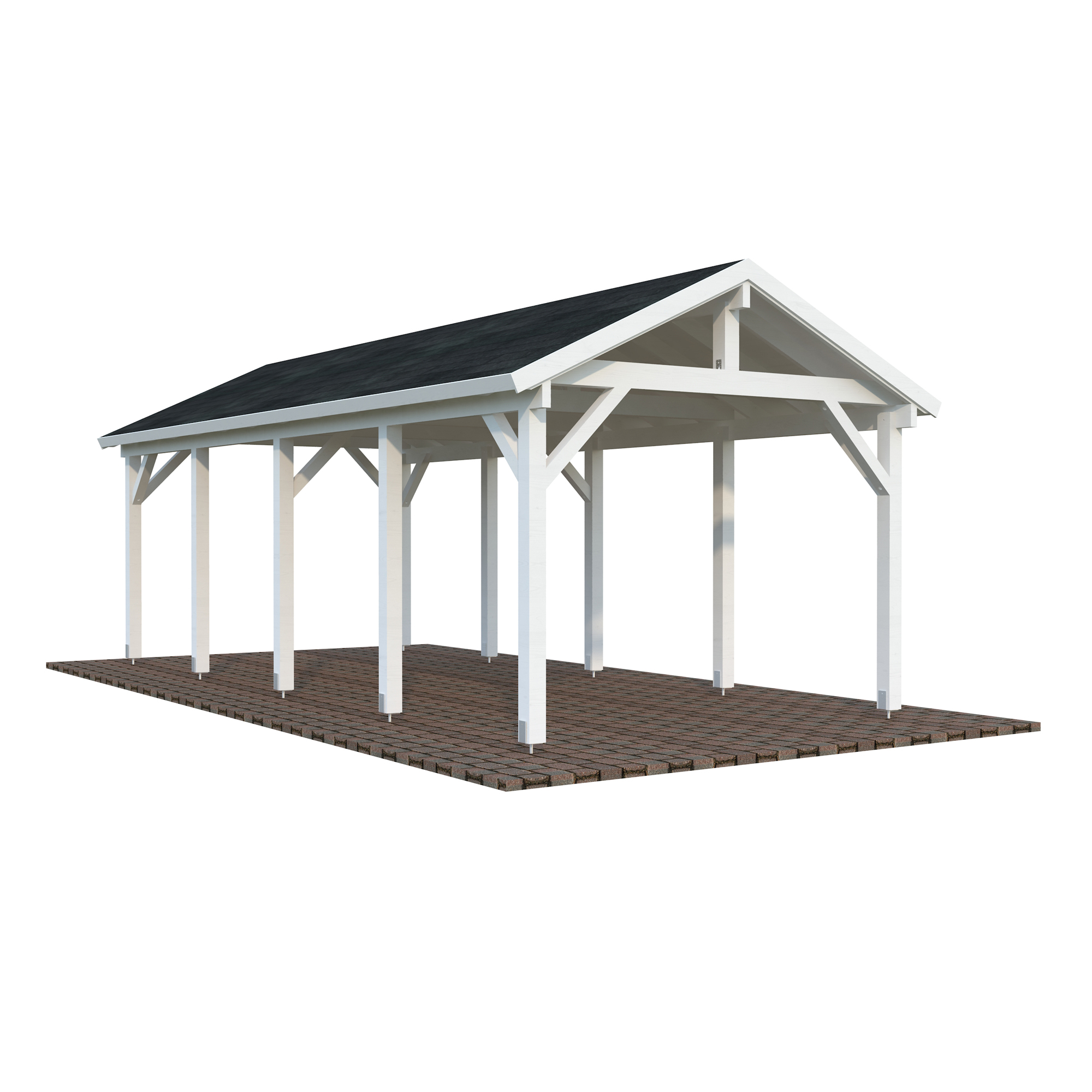 Palmakos Robert 23,1 m² är en klassisk carport med tio kraftiga stolpar och sluttande tak som smälter in bra med omkringliggande hus.