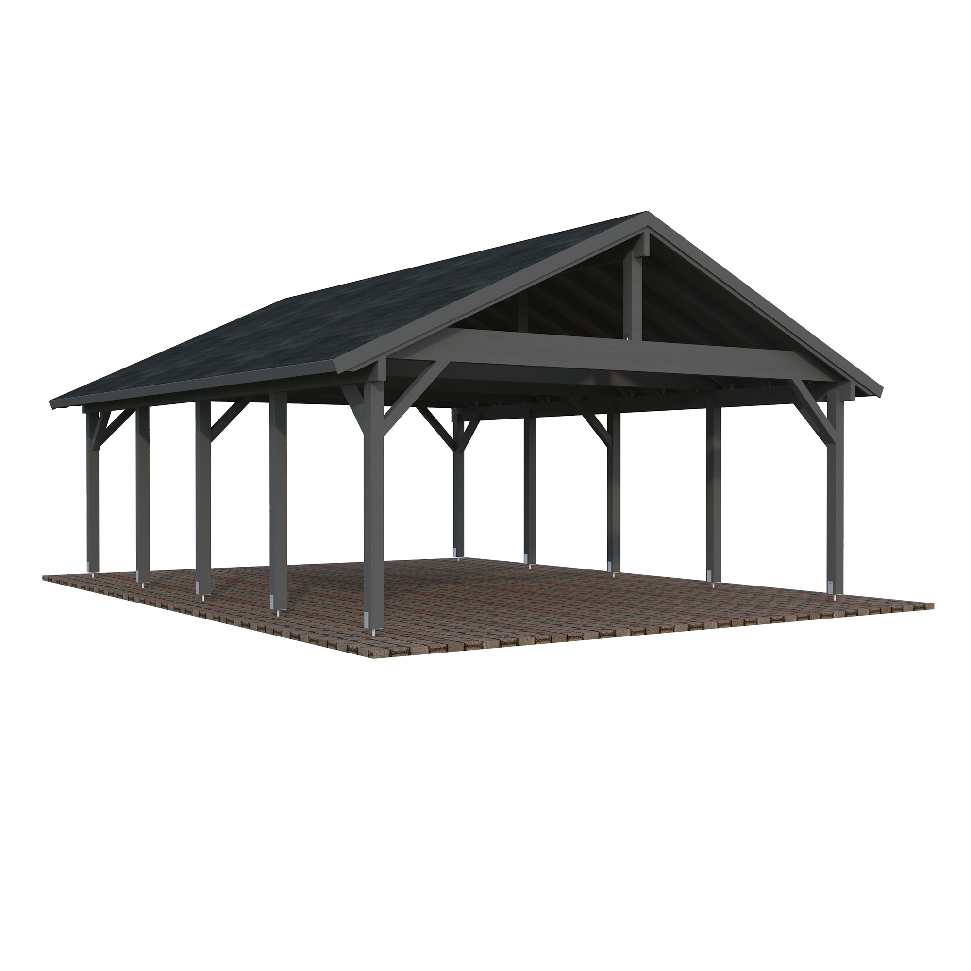 Palmakos Robert 40,6 m² är en klassisk carport med tio kraftiga stolpar och sluttande tak som smälter in bra med omkringliggande hus. Denna variant av Robert är en dubbel carport med plats för två bilar.