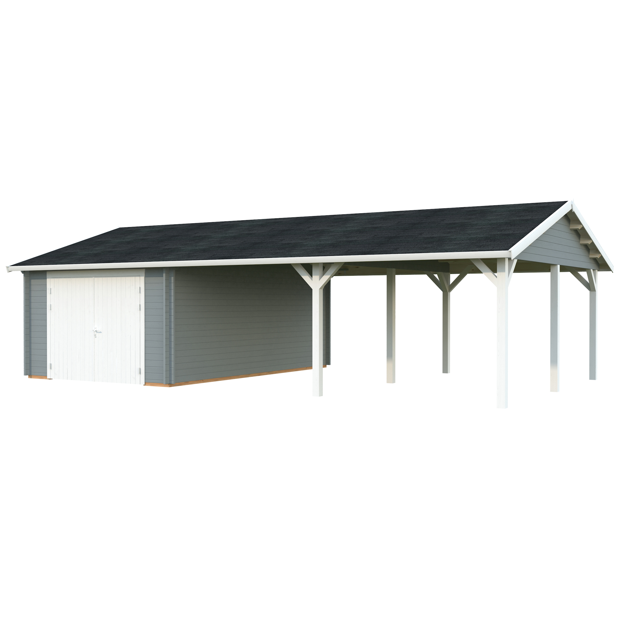 Palmakos garage Roger 19,0+33,2 m2 med solid 44 mm knuttimmervägg är inte bara den perfekta lösningen för att hålla din bil säkert inomhus, utan den har också funktionaliteten att behålla dina familjefordon under den skyddande carporten, samtidigt som det ger extra utrymme för dina förvaringsbehov. De generösa måtten gör att du kan parkera din bil bekvämt och har extra utrymme för verktyg, cyklar och andra föremål.