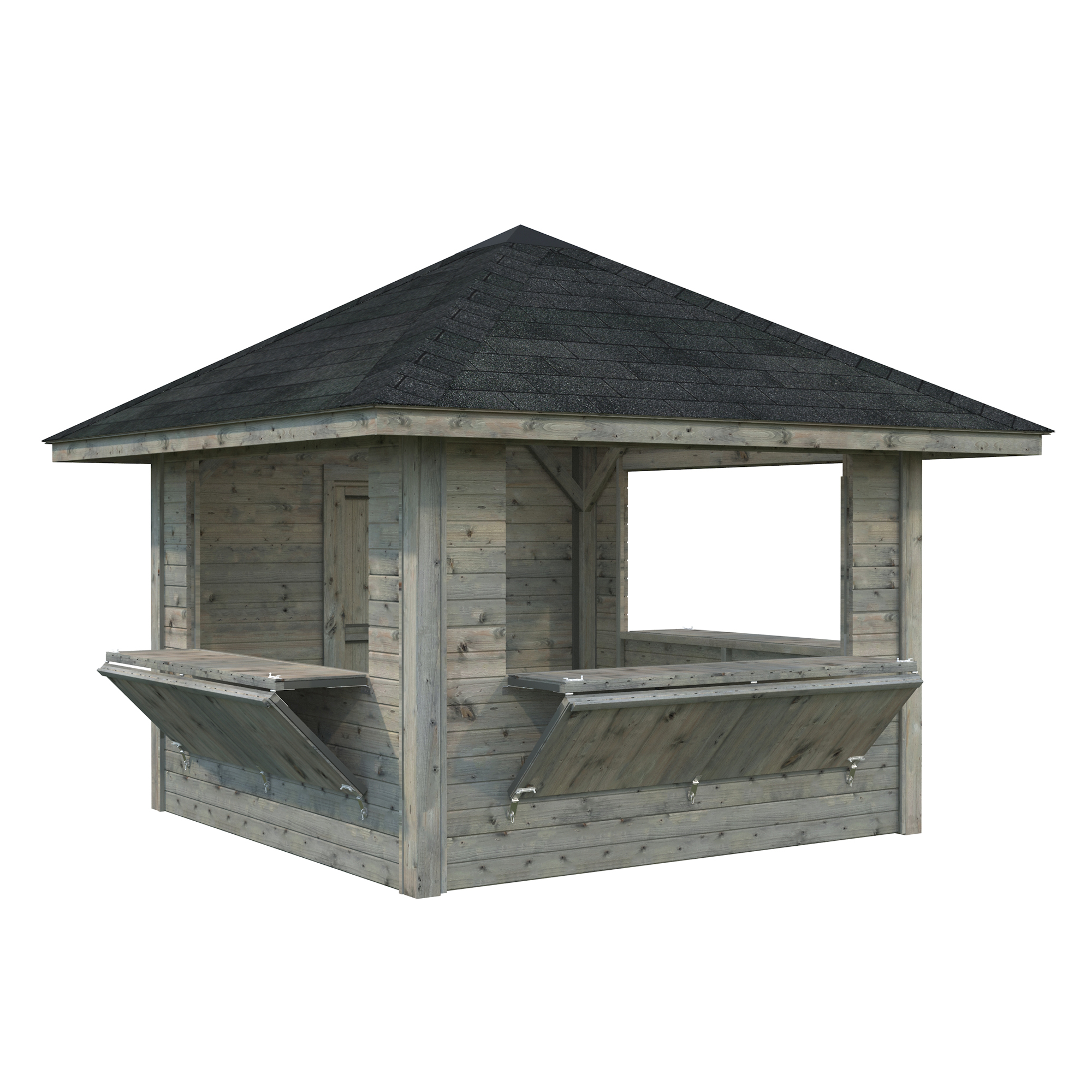 Kiosken är tillverkad av kraftig limträkonstruktion, 19 mm takskiva och 28 mm väggskiva, och är lätt att montera. Tillverkad av nordisk gran med 120x120 mm starka limträstolpar och 19 mm takbrädor. 28 mm väggstockar.