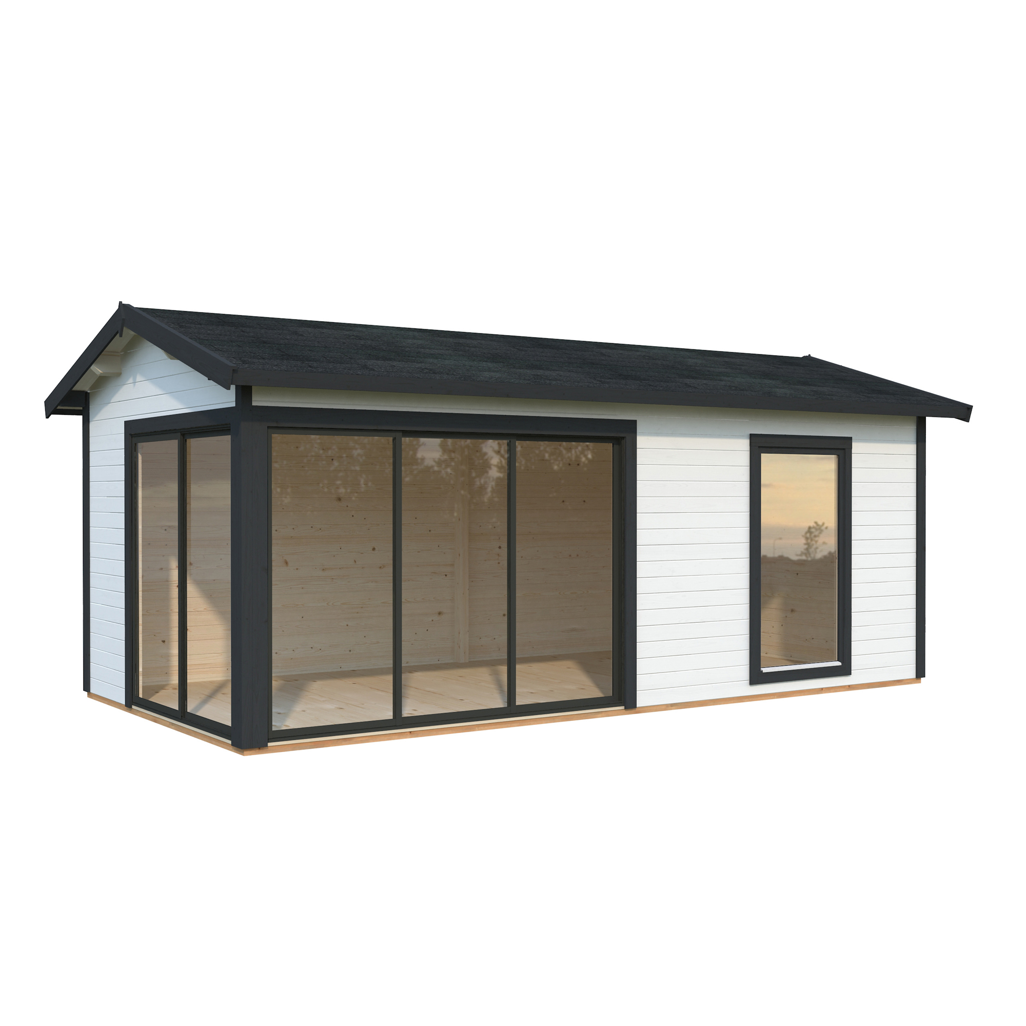 Palmakos stuga Amanda 17,1 m² Slide är ett mångsidigt och modernt trädgårdshus som passar perfekt för olika användningsområden. Med sina 44 mm tjocka väggar och sadeltak erbjuder den ett stilrent utseende. De två uppsättningarna av skjutdörrar i aluminium och härdat säkerhetsglas ger både en elegant design och ett bra ljusinsläpp, vilket gör den till ett ljust och luftigt utrymme.