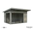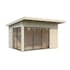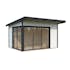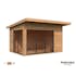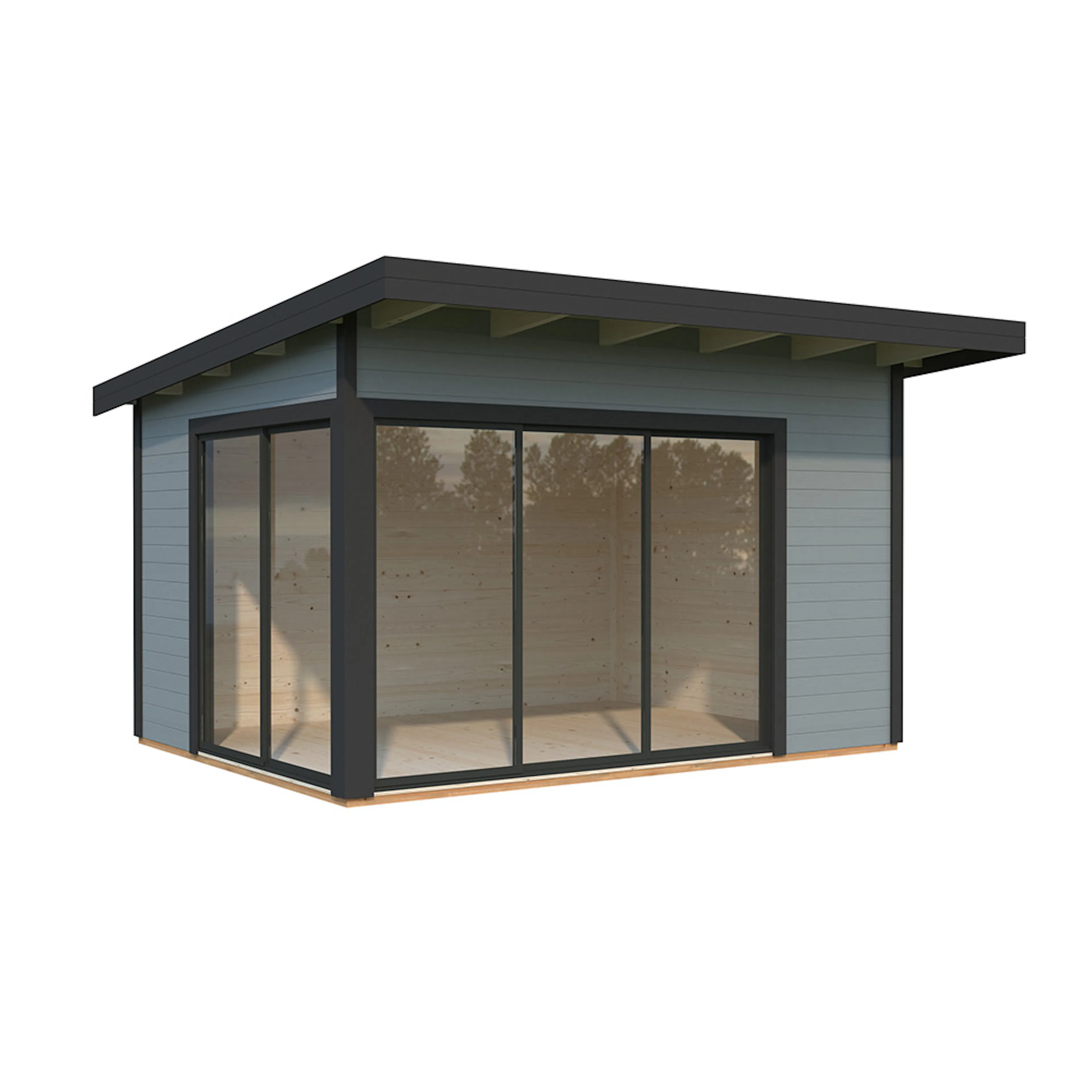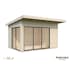 Stugan Andrea med flackt tak skapar ett modernt uttryck och blir ett stilfullt inslag i din trädgård. Skjutpartier finns även i två väggar så att dessa stora glasytorna släpper in generöst med ljus och tillåter fantastisk utsikt.