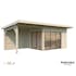 Stugan Andrea med förlängt flackt tak skapar ett modernt uttryck och blir ett stilfullt inslag i din trädgård. Skjutpartier finns även i två väggar så att dessa stora glasytorna släpper in generöst med ljus och tillåter fantastisk utsikt.