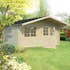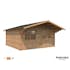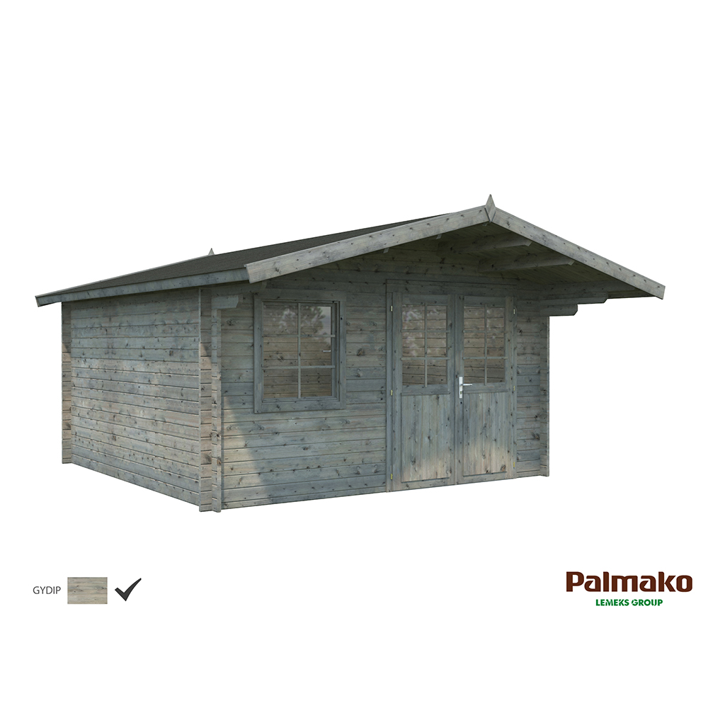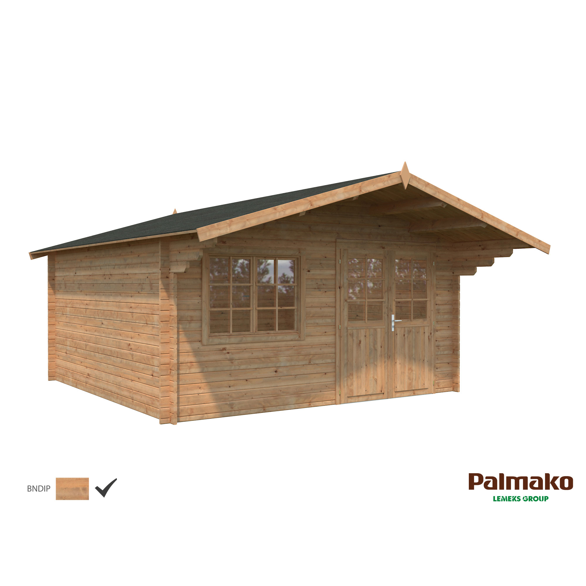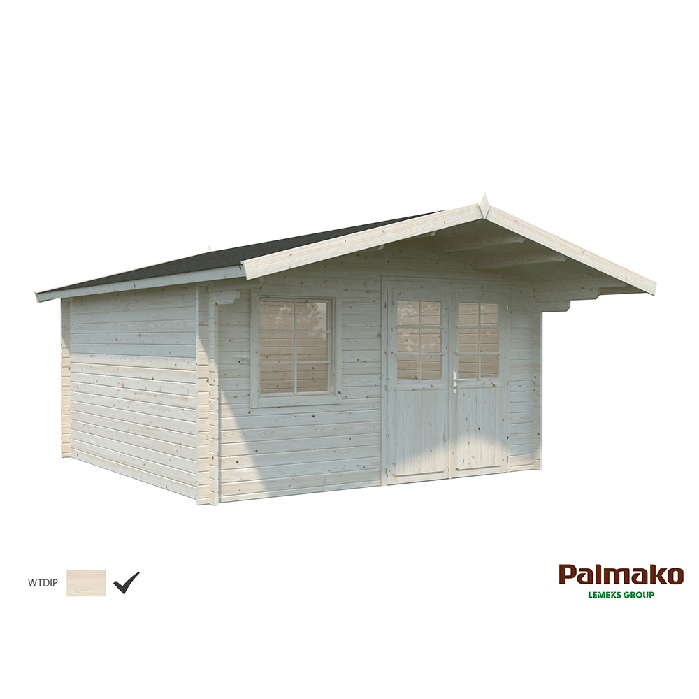 Stuga Ella från Palmako med 28 mm knuttimmer och överbyggd terrass. Stugan är inte snözonklassad - håll därför taket rent från större mängder snö.