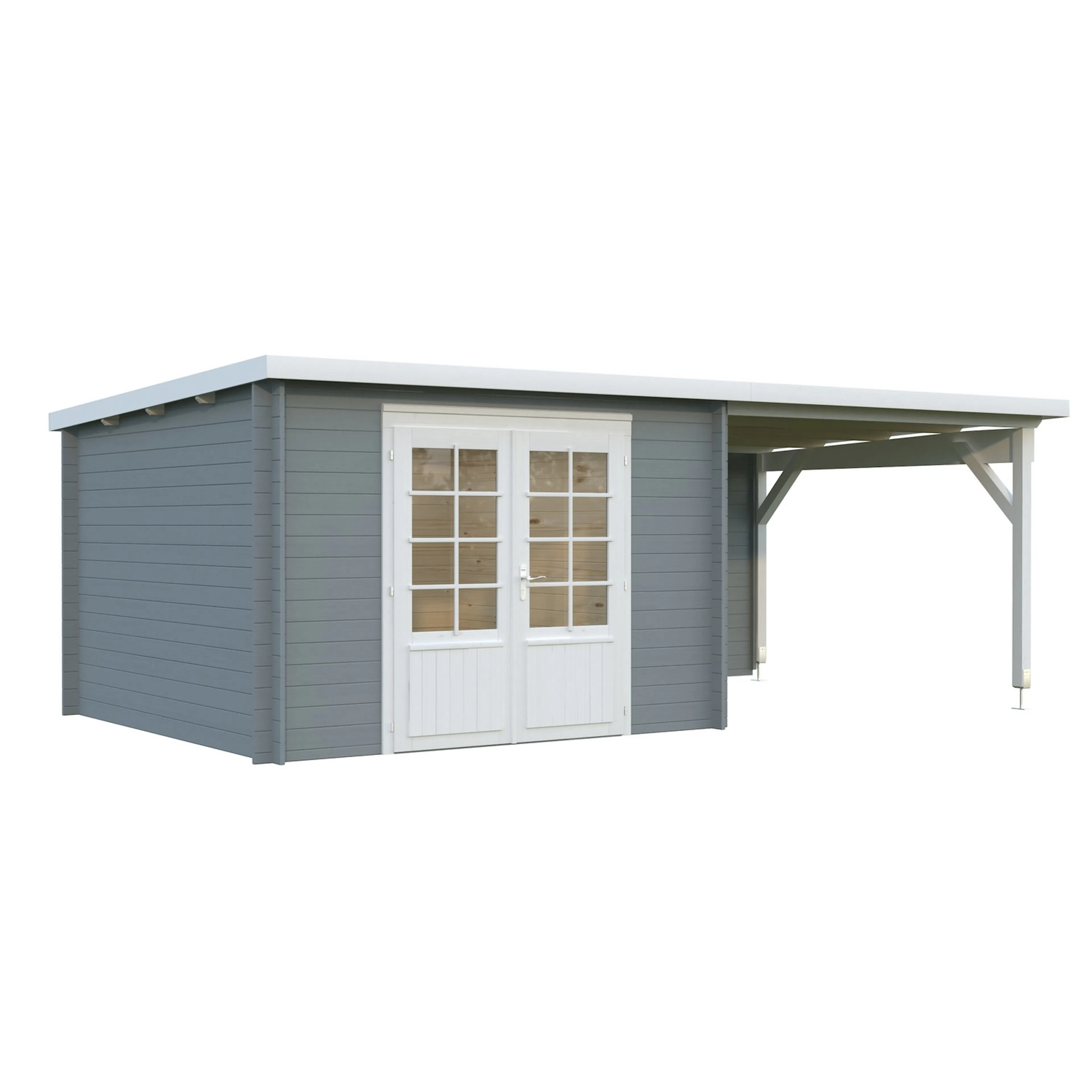 Stuga Ella från Palmako med 28 mm knuttimmer och överbyggd terrass. Stugan är inte snözonklassad - håll därför taket rent från större mängder snö.