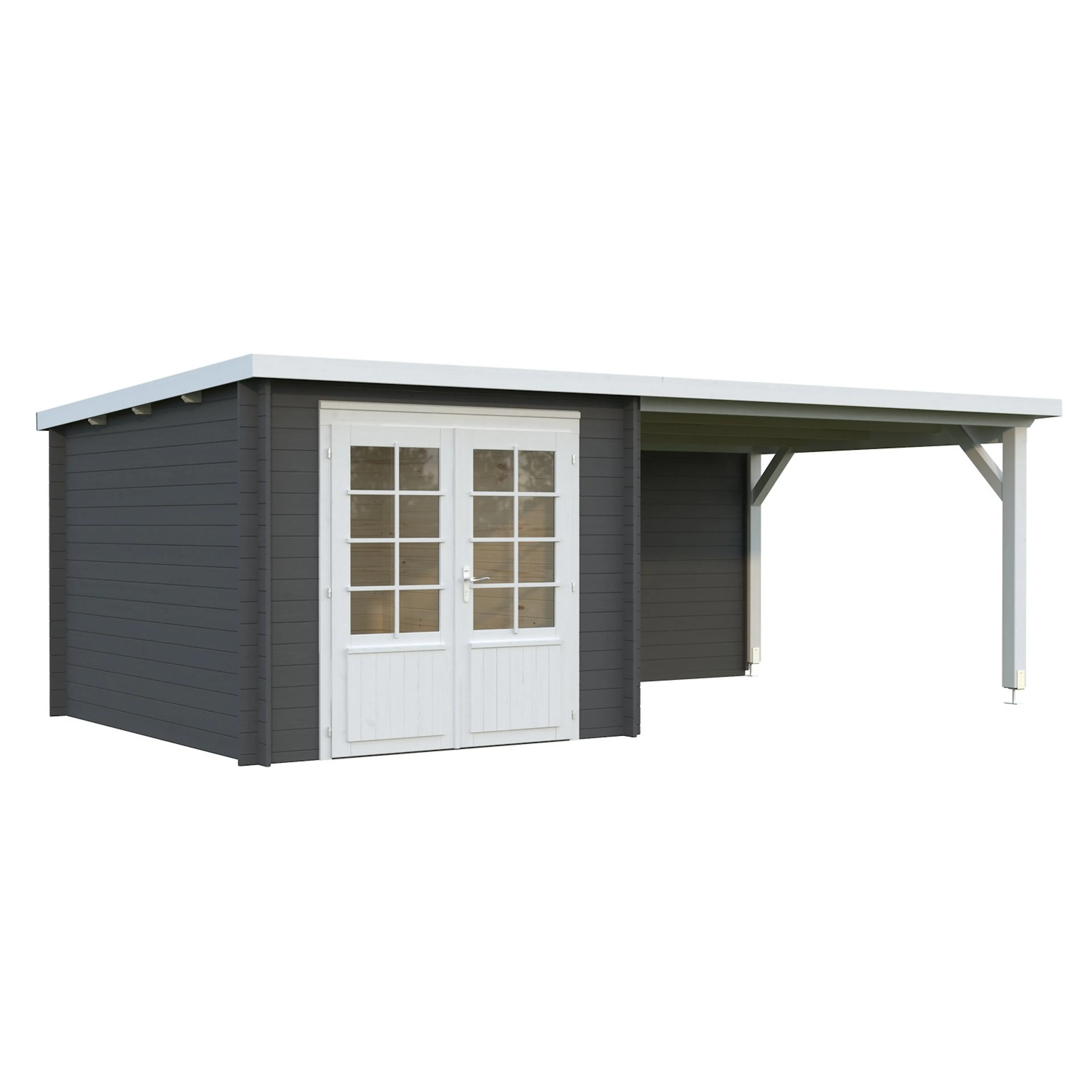 Stuga Ella från Palmako med 28 mm knuttimmer och överbyggd terrass. Stugan är inte snözonklassad - håll därför taket rent från större mängder snö.