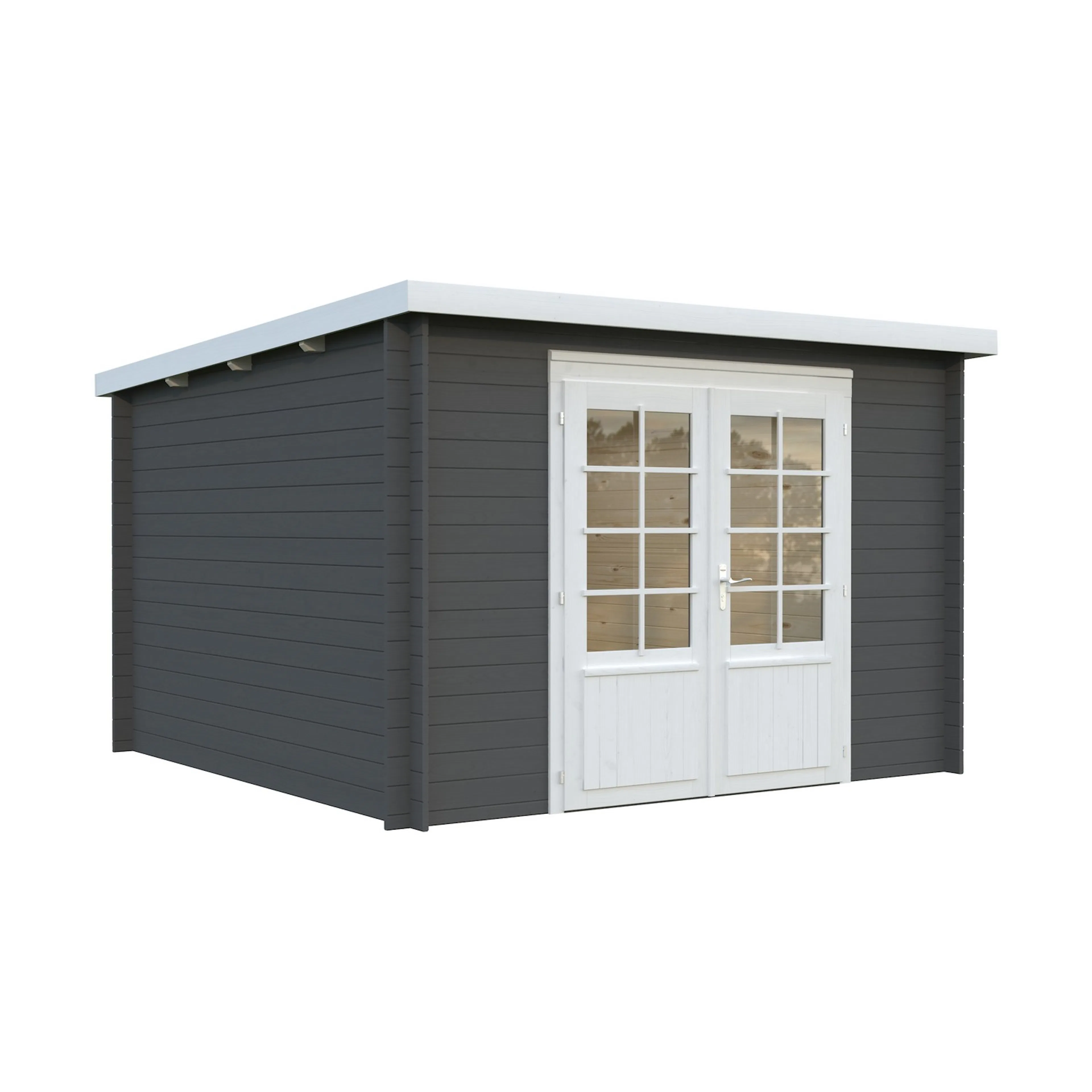 Uthuset Ella med det flacka taket och raka linjerna skapar ett modernt uttryck och blir ett stilfullt inslag i din trädgård. Uthuset knuttimras med 28mm tjocka väggar och har en halvglasad dubbeldörr med cilinderlås.