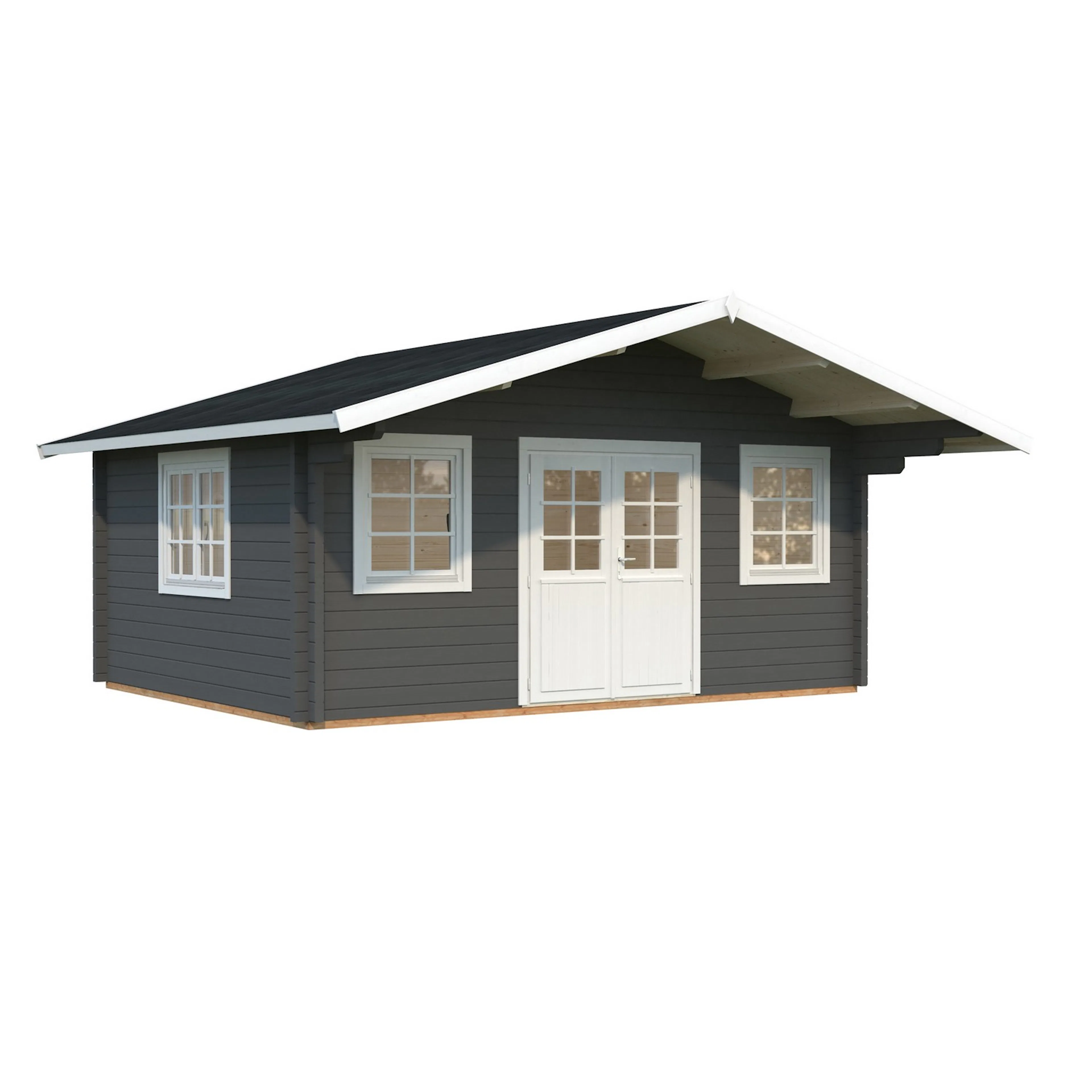 Uthuset Ella med det flacka taket och raka linjerna skapar ett modernt uttryck och blir ett stilfullt inslag i din trädgård. Uthuset knuttimras med 28mm tjocka väggar och har en halvglasad dubbeldörr med cilinderlås.