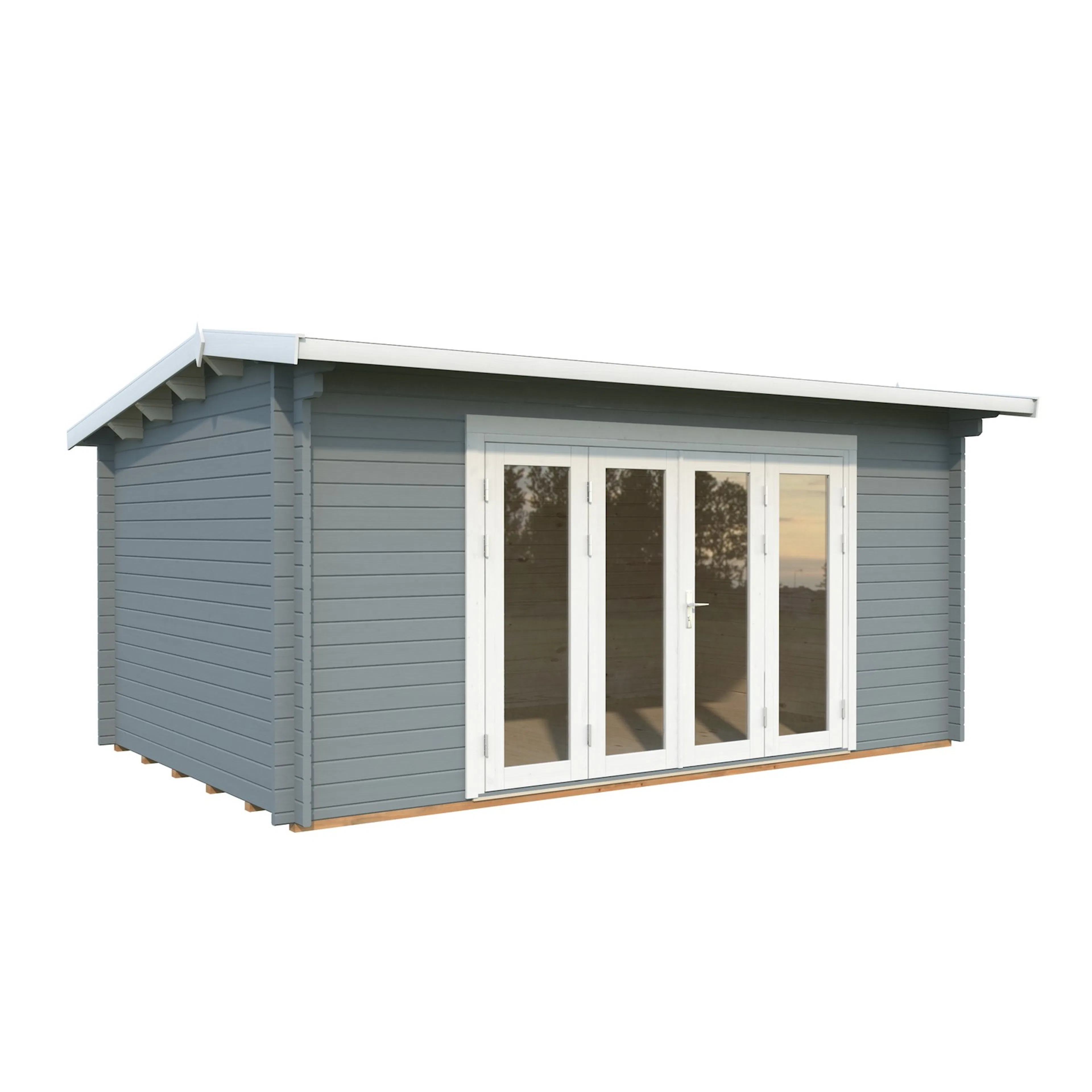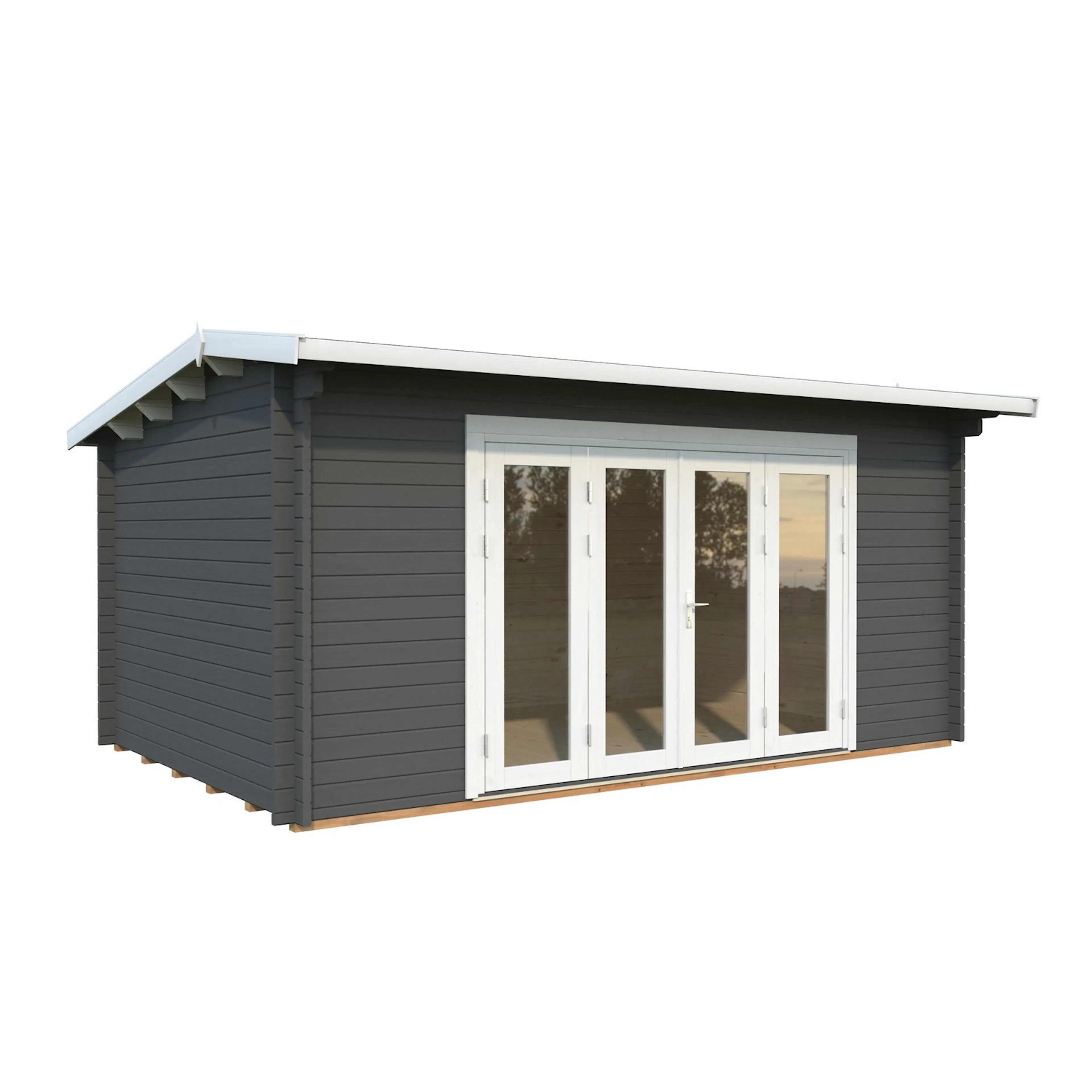 Uthuset Elsa med det flacka taket och raka linjerna skapar ett modernt uttryck och blir ett stilfullt inslag i din trädgård. Uthuset knuttimras med 28mm tjocka väggar och har en glasad dubbeldörr med cilinderlås samt ett litet fönster.