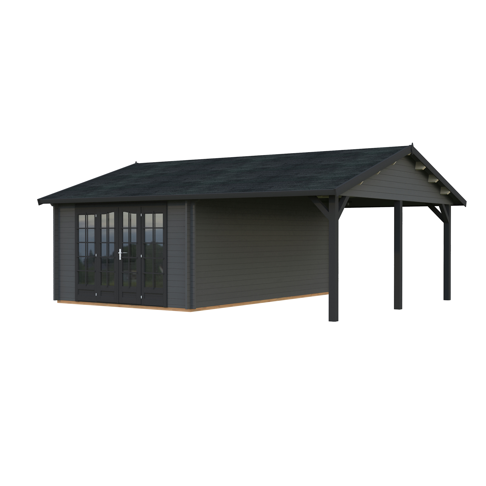 Palmakos stuga Irene 19,0+16,2 m² har ett klassiskt sadeltak och en rymlig takyta som är perfekt för att koppla av i trädgården, hålla små sammankomster, njuta av grillfest och middagsbjudningar. Den täckta takytan erbjuder gott om skydd för ditt utekök och trädgårdsmöbler. Den är idealisk för alla som vill skapa ett mångsidigt och bekvämt friluftsliv. Detta trädgårdshus kombinerar modern design med praktisk funktionalitet, vilket gör det perfekt för en mängd olika användningsområden.