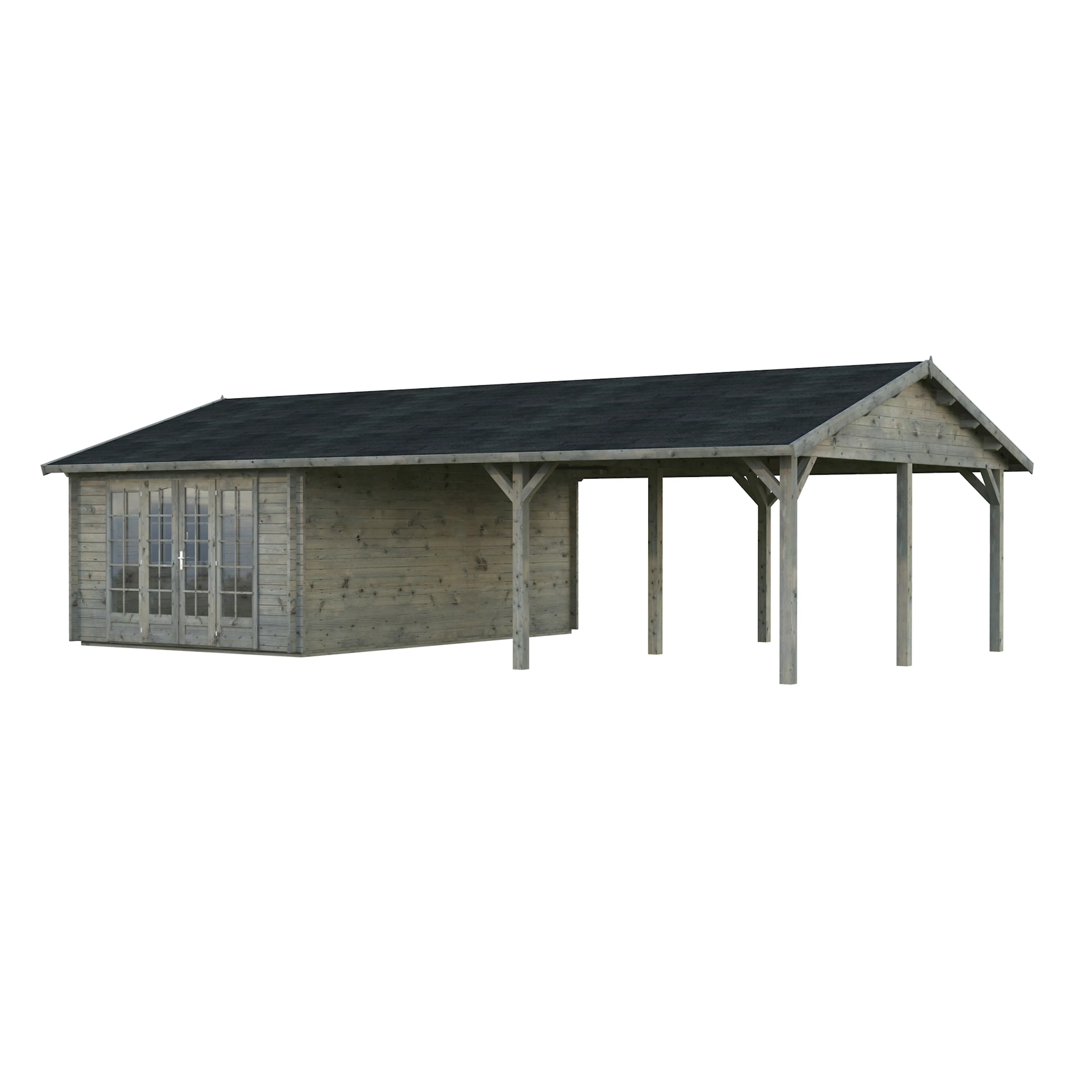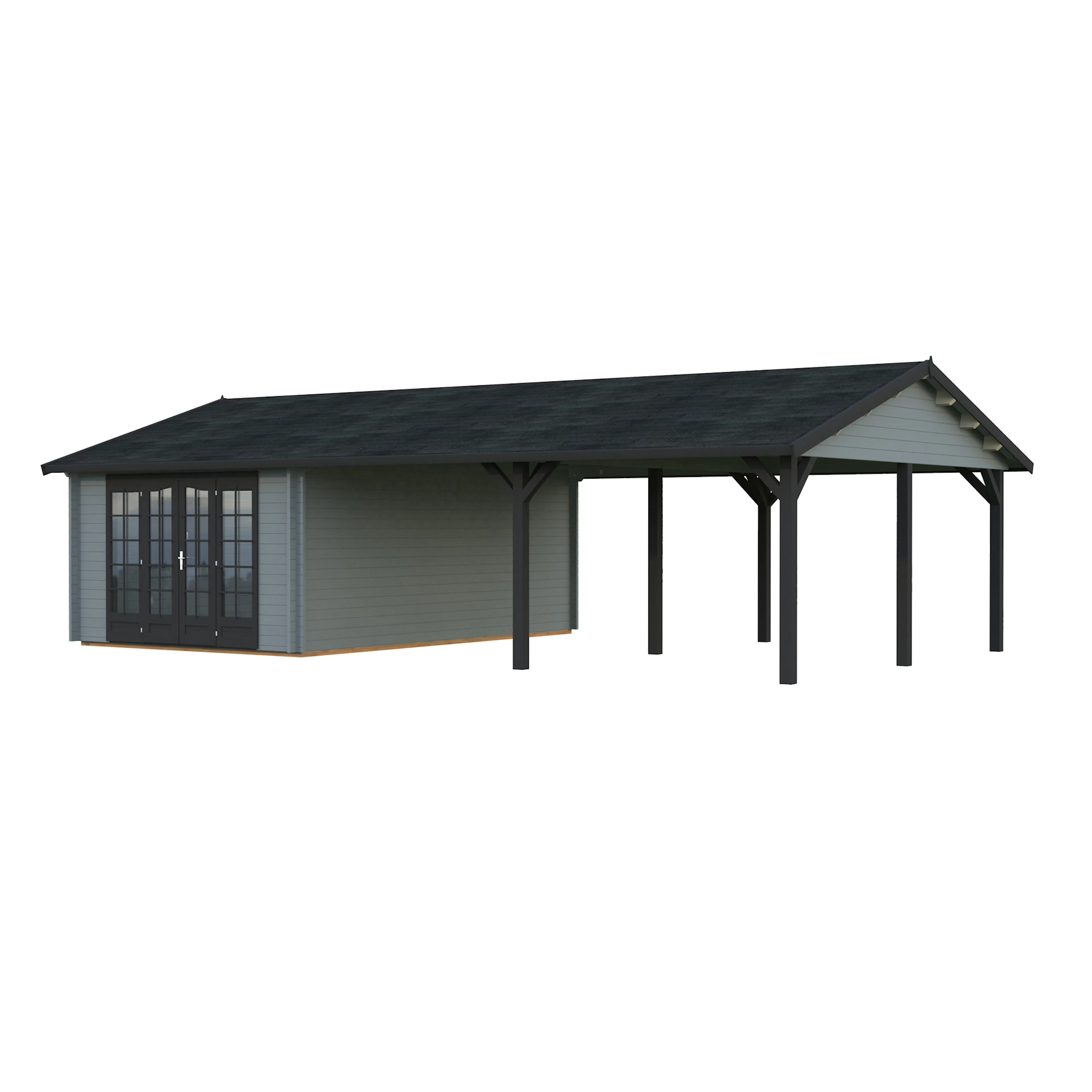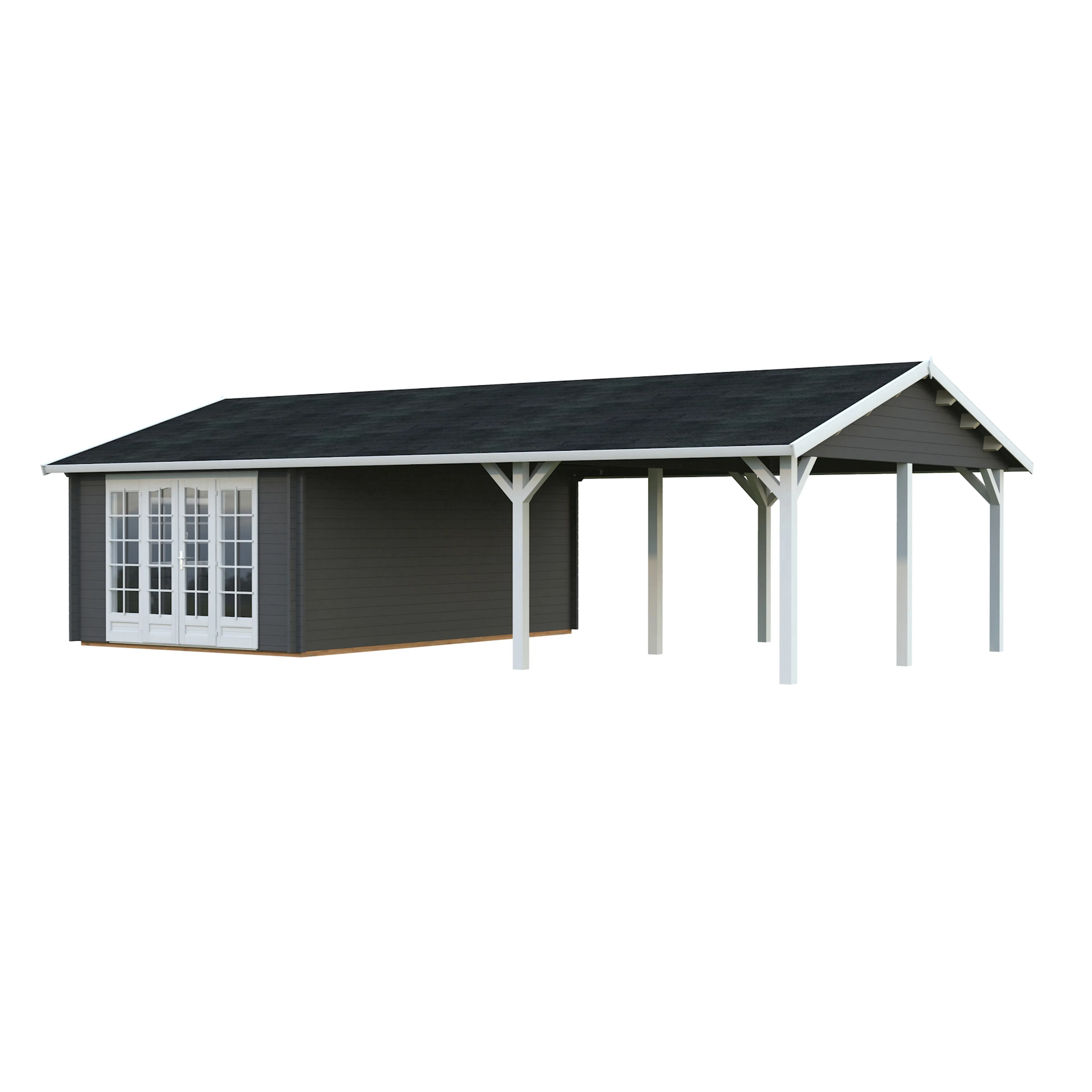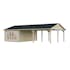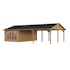 Palmakos stuga Irene 19,0+33,2 m² har ett klassiskt sadeltak och en rymlig takyta som är perfekt för att koppla av i trädgården, hålla små sammankomster, njuta av grillfest och middagsbjudningar. Den täckta takytan erbjuder gott om skydd för ditt utekök och trädgårdsmöbler. Den är idealisk för alla som vill skapa ett mångsidigt och bekvämt friluftsliv. Detta trädgårdshus kombinerar modern design med praktisk funktionalitet, vilket gör det perfekt för en mängd olika användningsområden.