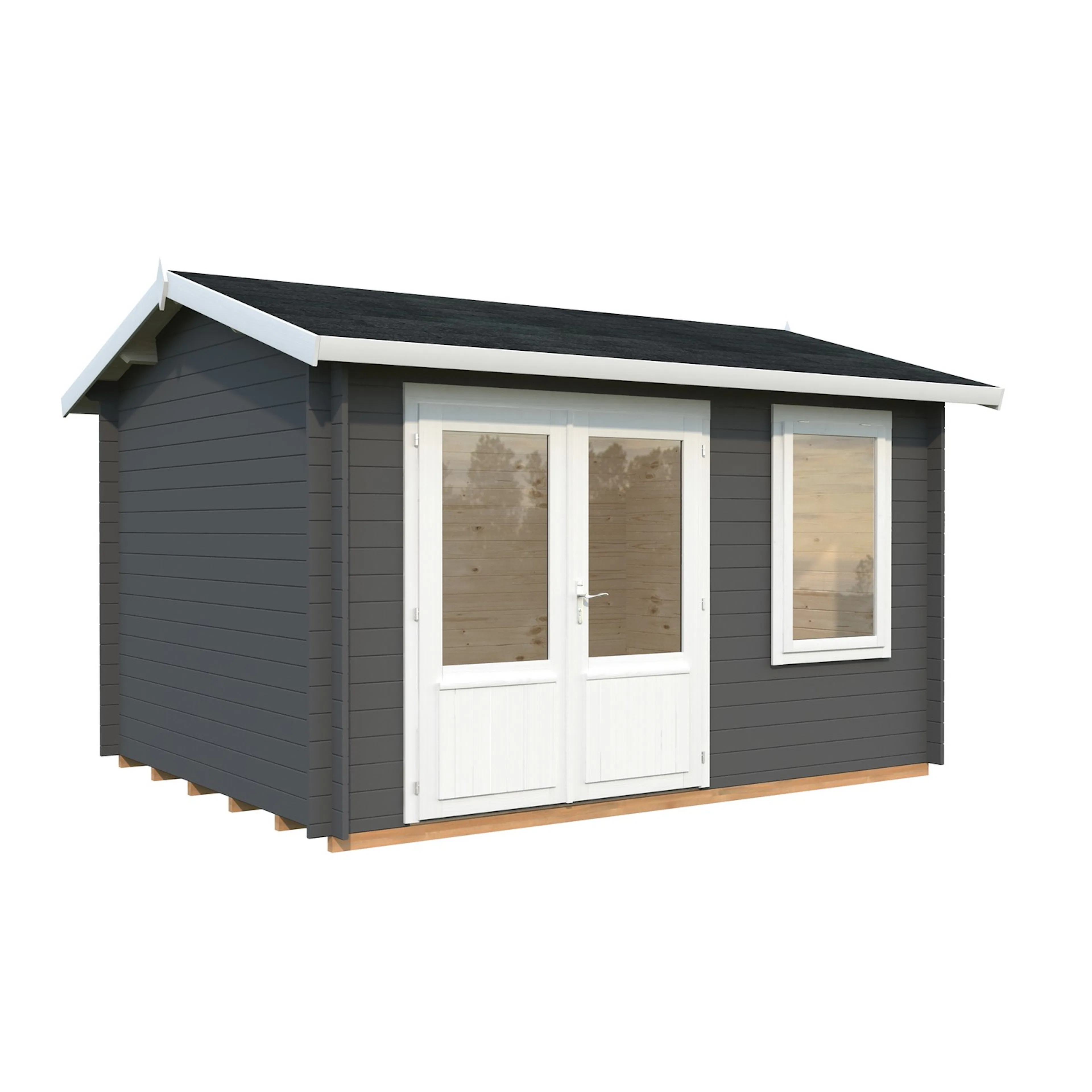 Stuga Iris är tillverkad av 28 mm knuttimmer med vindtäta dubbelhaksknutar. Stugan har en halvglasad pardörr med limträkarm, cylinderlås och rostfri plåt som skyddar tröskeln. Ett utgående fönster med enkelglas. Väggdetaljer med dubbelhaksknutar. 5 års garanti.