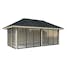 Tillverkad av nordisk gran med 120x120 mm starka limträstolpar och 19 mm takbrädor. Låsbara skjutdörrarna i 4 mm härdat glas och aluminium. 28 mm väggstockar.