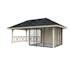 Tillverkad av nordisk gran med 120x120 mm starka limträstolpar och 19 mm takbrädor. Låsbara skjutdörrarna i 4 mm härdat glas och aluminium. 28 mm väggstockar.