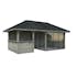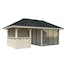 Tillverkad av nordisk gran med 120x120 mm starka limträstolpar och 19 mm takbrädor. Låsbara skjutdörrarna i 4 mm härdat glas och aluminium. 28 mm väggstockar.